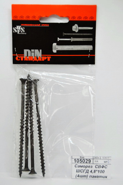 Саморез используется для крепления листов гипсокартона к деревянной обрешетке без предварительного сверления. Имеет потайную рожковую головку, крестообразный шлиц, острый наконечник, крупную резьбу.