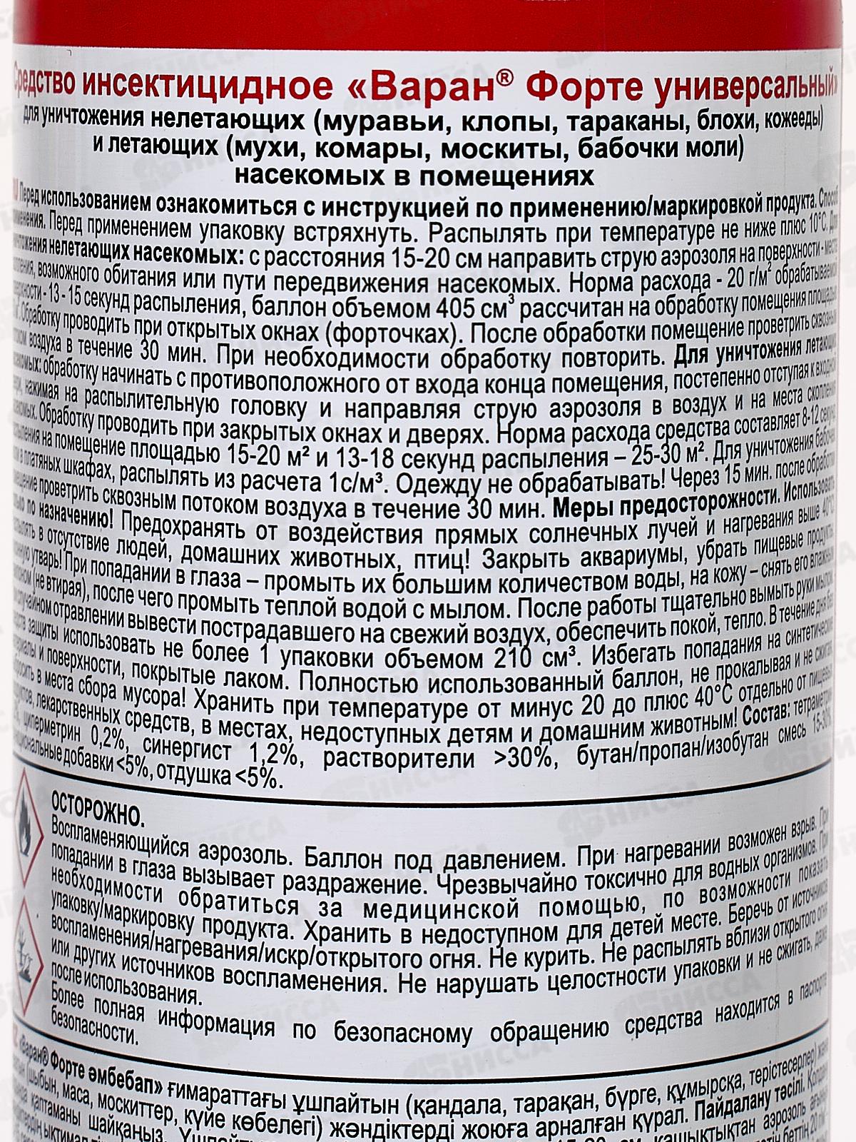 Состав: тетраметрин 0,2%, циперметрин 0,2%, синергист 1,2%, растворители более 30%, бутан/пропан/изобутан смесь 15-30%, функциональные добавки менее 5%.