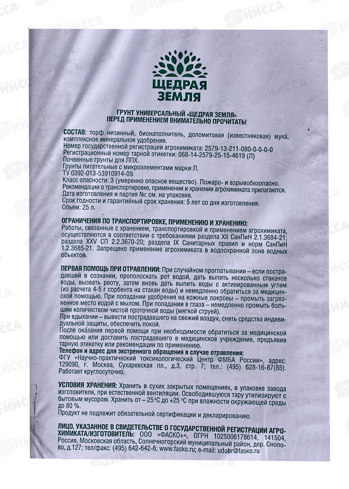 Почвогрунт Щедрая Земля универсальный 25 литров *1