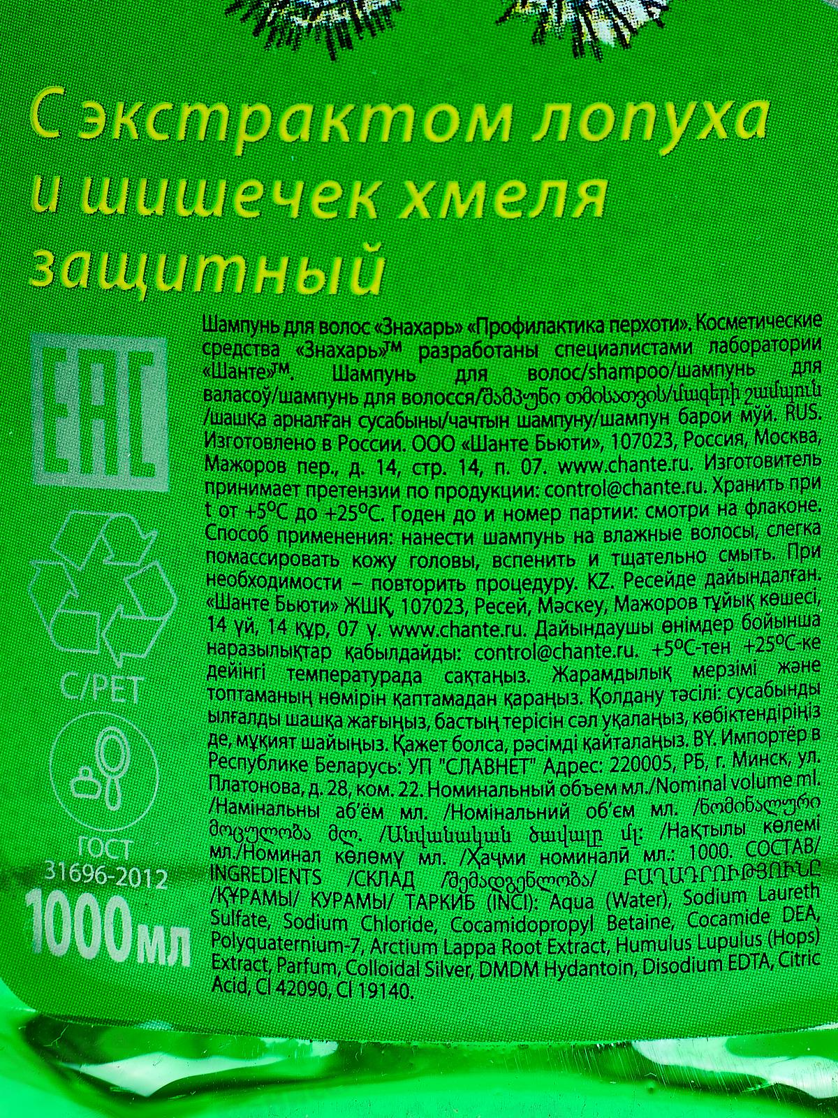 Состав: вода, лауретсульфат натрия, хлорид натрия, кокамид ДЭА, кокамидопропилбетаин, поликватерниум-7, экстракт корня лопуха, экстракт хмеля обыкновенного, отдушка, коллоидное серебро, ДМДМ гидантоин, динатриевая ЭДТА, лимонная кислота, CI 42090, CI 19140.