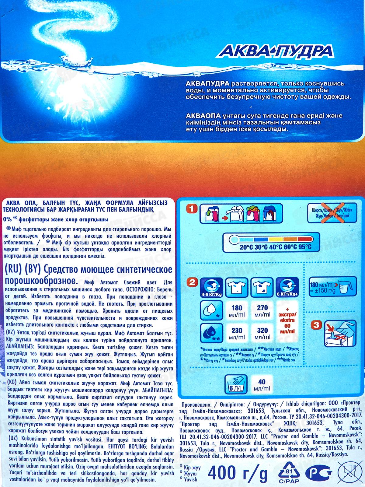 Порошок Миф «Свежий цвет» обеспечивает отличный результат машинной стирке. Его формула с пониженным уровнем пенообразования значительно облегчает процесс полоскания белья, качественно очищает вещи и сохраняет яркость красок. Средство содержит специальные энзимы, которые отлично действуют даже в холодной воде. А эффективные компоненты защитят стиральную машину от накипи и известкового налёта. Это профессиональный стиральный порошок, специальная формула которого обеспечивает восхитительную свежесть и чистоту.