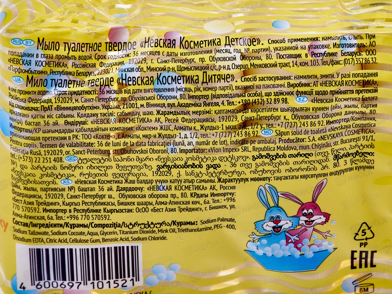 Состав: талловат натрия, пальмат натрия, пальмоядровый кернелат натрия, стеарат натрия, глицерин, вода, диоксид титана, триэтаноламин, ПЭГ-400, динатриевая соль ЭДТА, лимонная кислота, целлюлозная камедь, бензойная кислота, хлорид натрия.