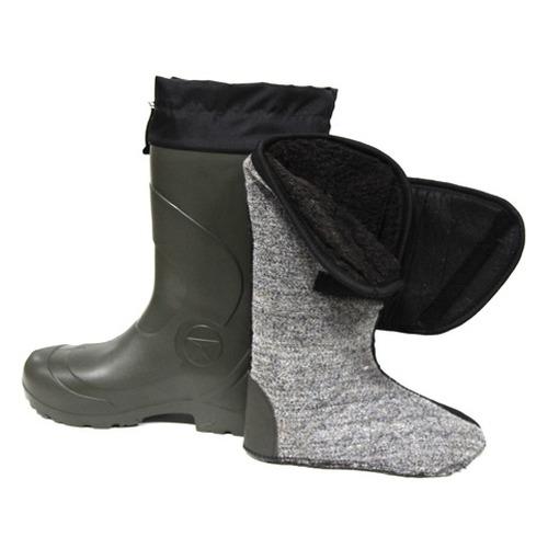 Сапог цельнолитой из материала ЭВА. Подошва - направленный ассиметричный противоскользящий протектор. Вкладыш 7 слойный с мехом. Мембранная сетка, нетканое синтетическое полотно, фольга. Средний слой выполнен из натурального материала с 100% содержанием льна и шерсти. Нетканое полотно нового поколения. Трикотажное полотно с добавлением специального гидрофобного волокна. Мягкий мех с содержанием 100% овечьей шерсти.