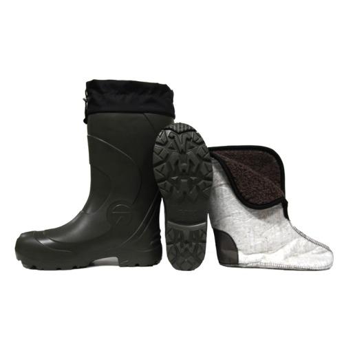 Сапог цельнолитой из материала ЭВА. Подошва - направленный ассиметричный противоскользящий протектор. Вкладыш 4 слойный. 1. Спандбонд впитывает излишки образовавшегося конденсата. 2. Фольга создает эффект термоса. 3. Полотно из полых волокон оберегает от холода. 4. Натуральный шерстяной мех сохраняет тепло.