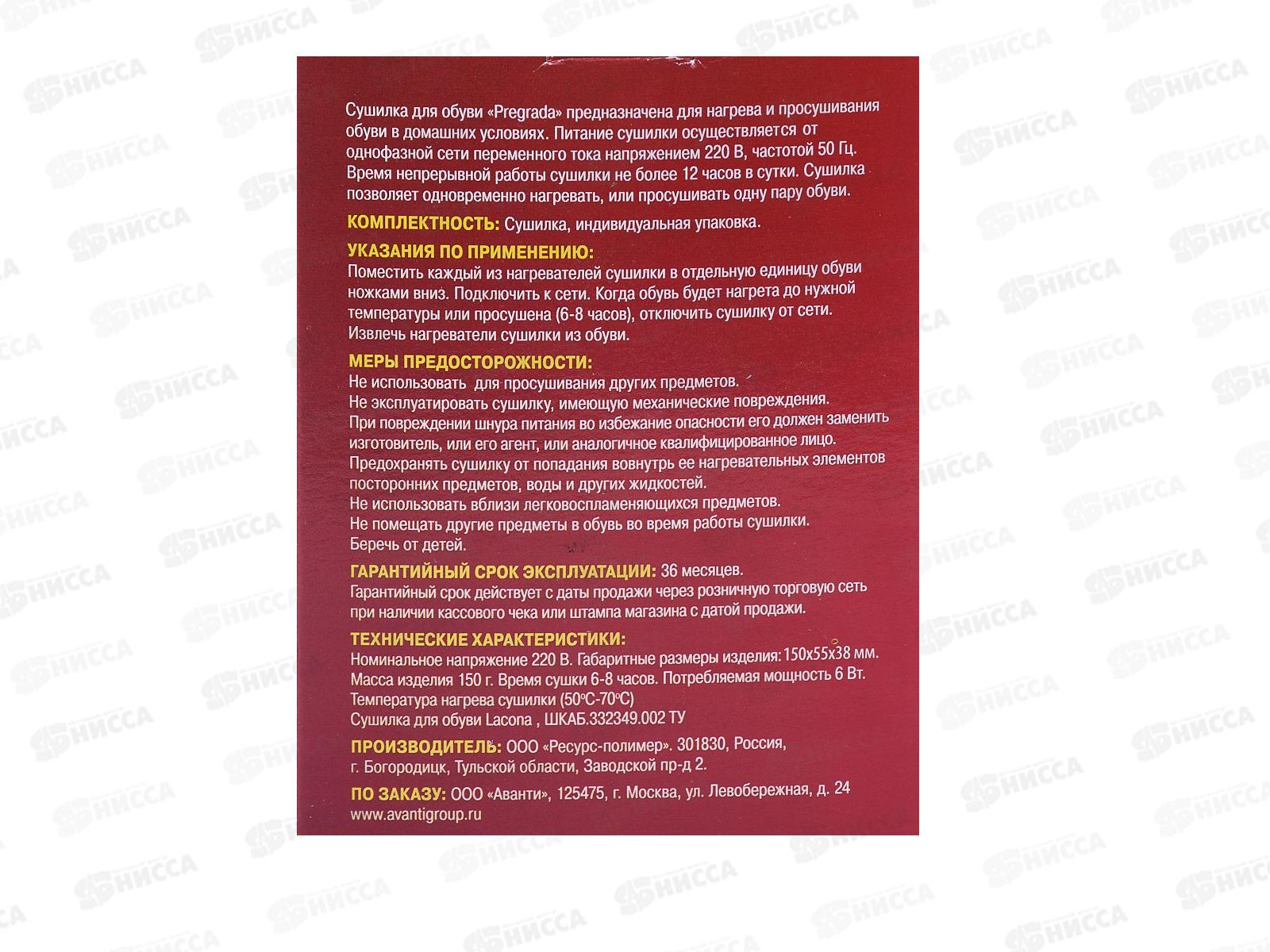 Сушилка для обуви «Pregrada» предназначена для нагрева и просушивания обуви в домашних условия. Питание сушилки осуществляеться от однофазной сети переменого тока напряжением 220 В, частотой 50 Гц. Время непрерывной работы сушилки не более 12 часов в сутки. Сушилка позволяет одновременно нагревать или просушивать одну пару обуви. Благодаря компактному размеру, сушилка идеально подходит для всех типов обуви. Способ применения: Поместить каждый из нагревателей сушилки в отдельную единицу обуви ножками вниз, подключить к сети. Когда обувь будет нагрета до нужной температуры или просушена (6-8 часов), отключить сушилку от сети. Извлечь нагреватели сушилки из обуви.