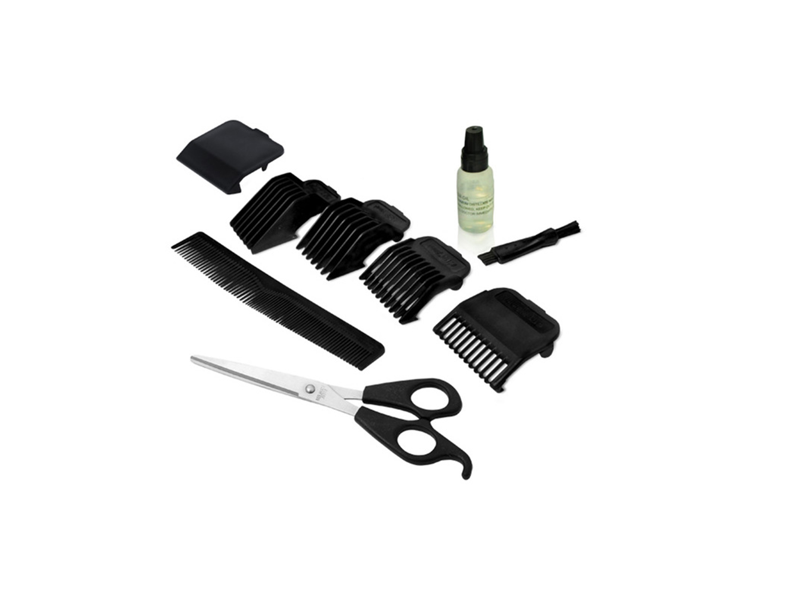 Комплектация: насадки для стрижки - 4 шт, щеточка для чистки лезвий, расческа, ножницы, м