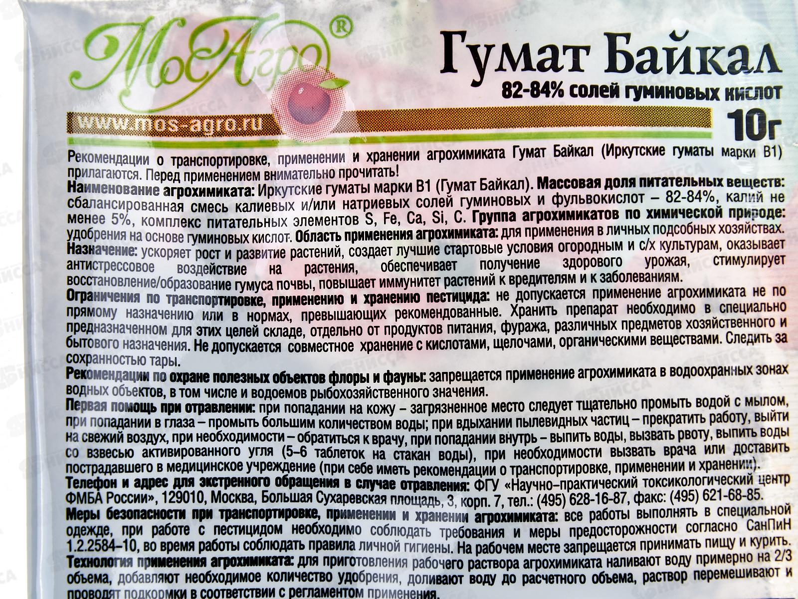 "Гумат Байкал" - это комплексное органо-минеральное микроудобрение, содержащее Объемь необходимый набор микроэлементов для подкормки овощных, ягодных, цветочных культур и комнатных растений. Одновременно является регулятором роста растений. Препарат применяется без ограничений для замачивания семян, обработки почвы и растений. Универсальность действия позволяет улучшить структуру и плодородие почвы, ускорить созревание урожая и увеличить его, стимулировать накопление плодами минеральных веществ и витаминов.