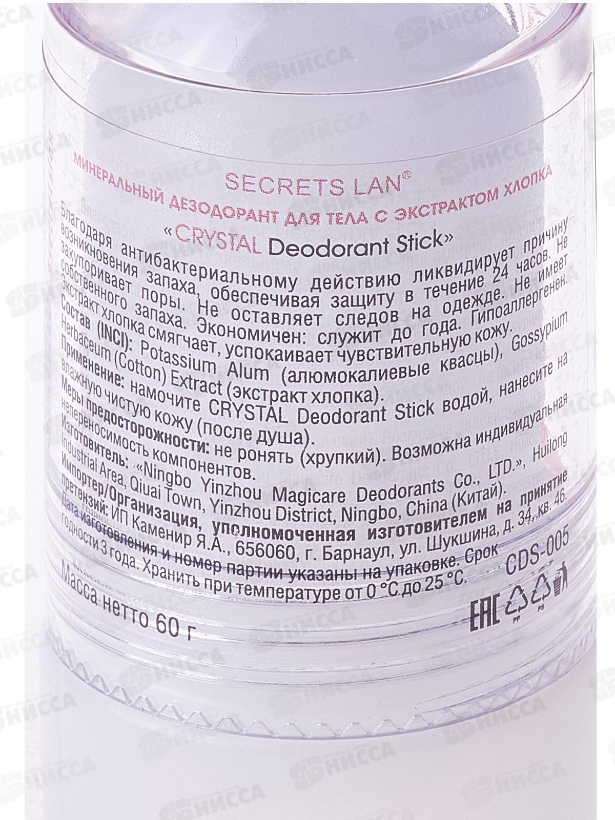 Женский дезодорант Secret Lan Crystal с экстрактом хлопка – это натуральный дезодорант кристалл, который обеспечивает надежную защиту от пота и запаха. Он представляет собой твердый кристаллический дезодорант, безопасный для использования и гипоаллергенный. Crystal подходит не только для женщин, но и для девочек-подростков. Он обеспечивает надежную защиту от неприятных запахов в период гормональных изменений и активного роста, а экстракт хлопка ухаживает за кожей и обеспечивает ей мягкость и свежесть. Кристальный дезодорант очень экономичен – одного стика хватает на год. А благодаря компактным размерам, его удобно брать с собой в путешествие, даже в ручную кладь самолета.. В состав дезодоранта не входят вредные химические вещества: хлоргидрат алюминия, парабены, красители, консерванты и т.д. Вместо них дезодорант минерал содержит 100% натуральные алюмокалиевые квасцы (алунит) и экстракт хлопка. При контакте с кожей алюмокалиевые квасцы образуют тонкую пленку, которая предотвращает размножение бактерий и возникновение запаха. При этом кожа продолжает дышать.