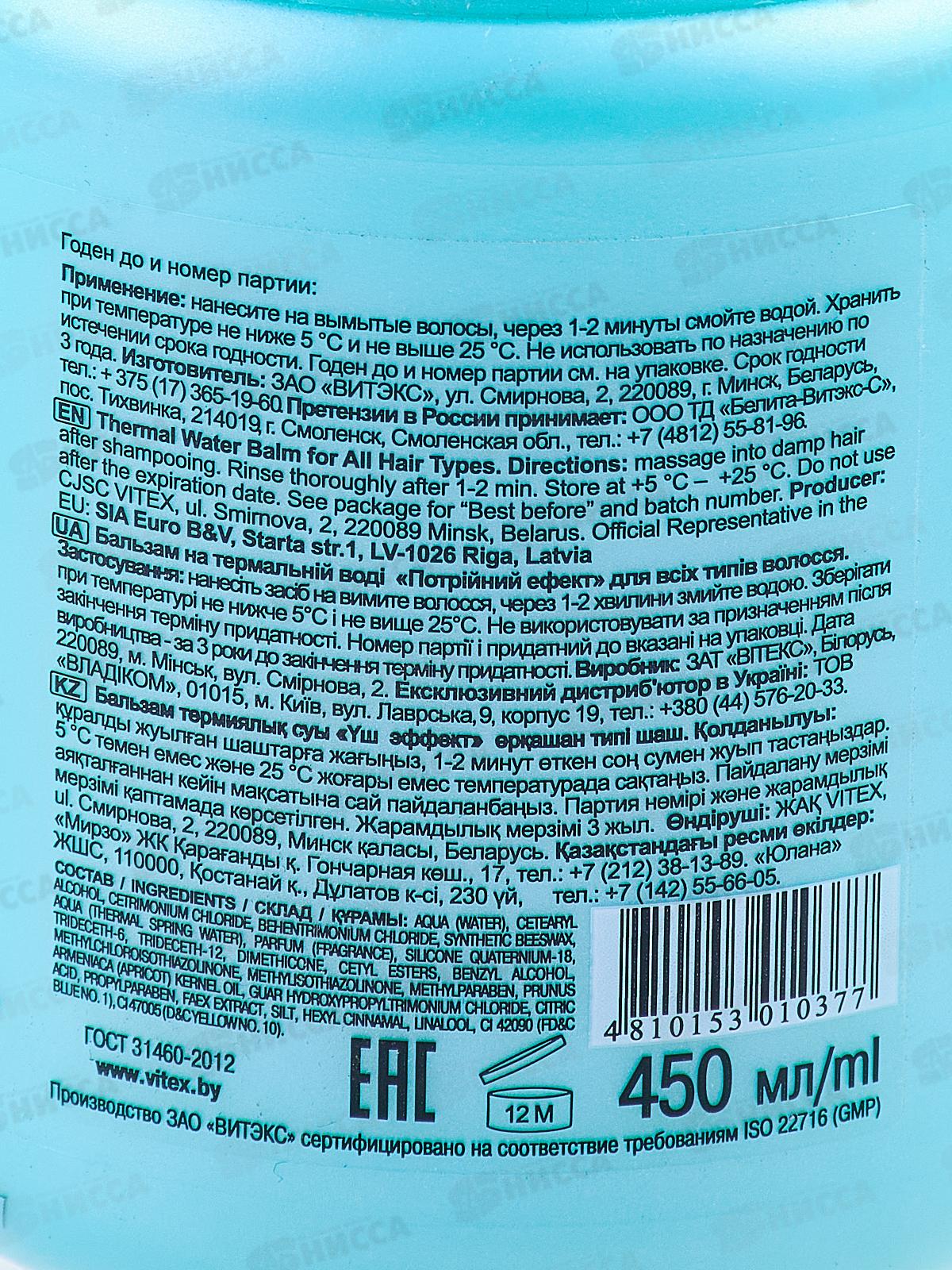 Укрепляет корни и структуру волос, укрепляет луковицы волос, обеспечивает волосам дополнительный объем и блеск, делает волосы послушными. Подходит для ежедневного использования. Состав: ВОДА, ЦЕТЕАРИЛОВЫЙ СПИРТ, ХЛОРИД ЦЕТРИМОНИЯ, ХЛОРИД БЕГЕНТРИМОНИЯ, ВОСК ПЧЕЛИНЫЙ СИНТЕТИЧЕСКИЙ, ТЕРМАЛЬНАЯ ВОДА, СИЛИКОН КВАТЕРНИУМ-18, ТРИДЕЦЕТ-6, ТРИДЕЦЕТ-12, ПАРФЮМЕРНАЯ КОМПОЗИЦИЯ, ДИМЕТИКОН, ЦЕТИЛОВЫЕ ЭФИРЫ, МЕТИЛПАРАБЕН, БЕНЗИЛОВЫЙ СПИРТ, МЕТИЛХЛОРИЗОТИАЗОЛИНОН, МЕТИЛИЗОТИАЗОЛИНОН, ХЛОРИД ГУАРГИДРОКСИПРОПИЛТРИМОНИЯ, МАСЛО КОСТОЧЕК PRUNUS ARMENIACA (АБРИКОСА), ЛИМОННАЯ КИСЛОТА, ПРОПИЛПАРАБЕН, ЭКСТРАКТ ПИВНЫХ ДРОЖЖЕЙ, ТЕРМАЛЬНЫЕ ОТЛОЖЕНИЯ, CI 42090, CI 47005, CI 42090, ГЕКСИЛЦИННАМАЛЬ, ЛИНАЛОЛ, БУТИЛФЕНИЛМЕТИЛПРОПИОНАЛЬ