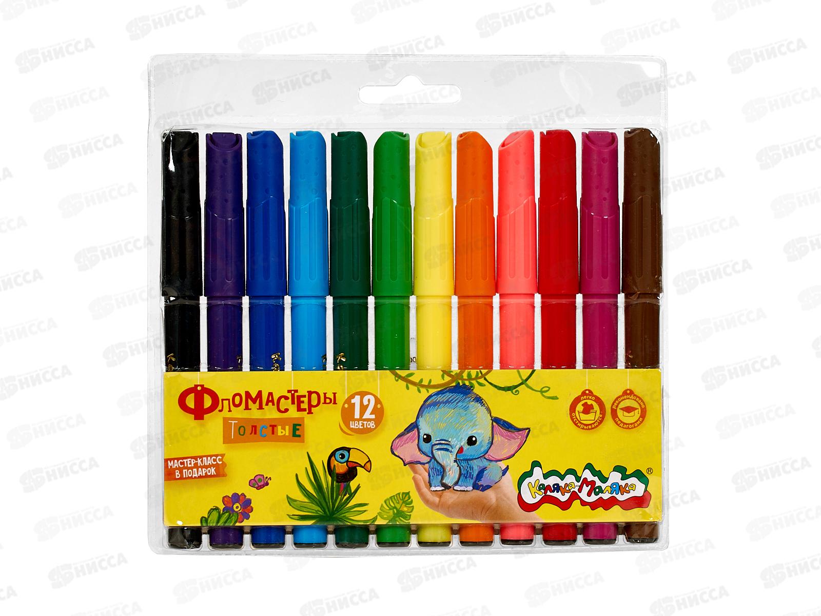 Фломастеры толстые Каляка - Маляка одни из самых ярких, долговечных и безопасных фломастеров на рынке. Разработаны для детей в возрасте от 3 лет. Богатая палитра ярких сочных цветов позволит детям воплотить любую фантазию в рисунок. Выпускаются в удобном пластиковом блистере с европодвесом. Утолщённый корпус фломастера 13,6 мм. Диаметр пишущего наконечника 4,3 мм. В наборе 12 ярких, сочных цветов. Богатая палитра оттенков. Фломастеры Каляка - Маляка соответствуют самым высоким мировым стандартам качества и безопасности! Полипропиленовый корпус обладает повышенной устойчивостью к излому, не образует острых краев при повреждении. Безопасный вентилируемый колпачок обеспечит свободное прохождение воздуха при случайном попадании в дыхательные пути. Прочный пишущий узел не деформируется и не продавливается. Чернила на водной основе. Свежие следы фломастеров легко отстирываются с большинства тканей и смываются с кожи ребёнка!