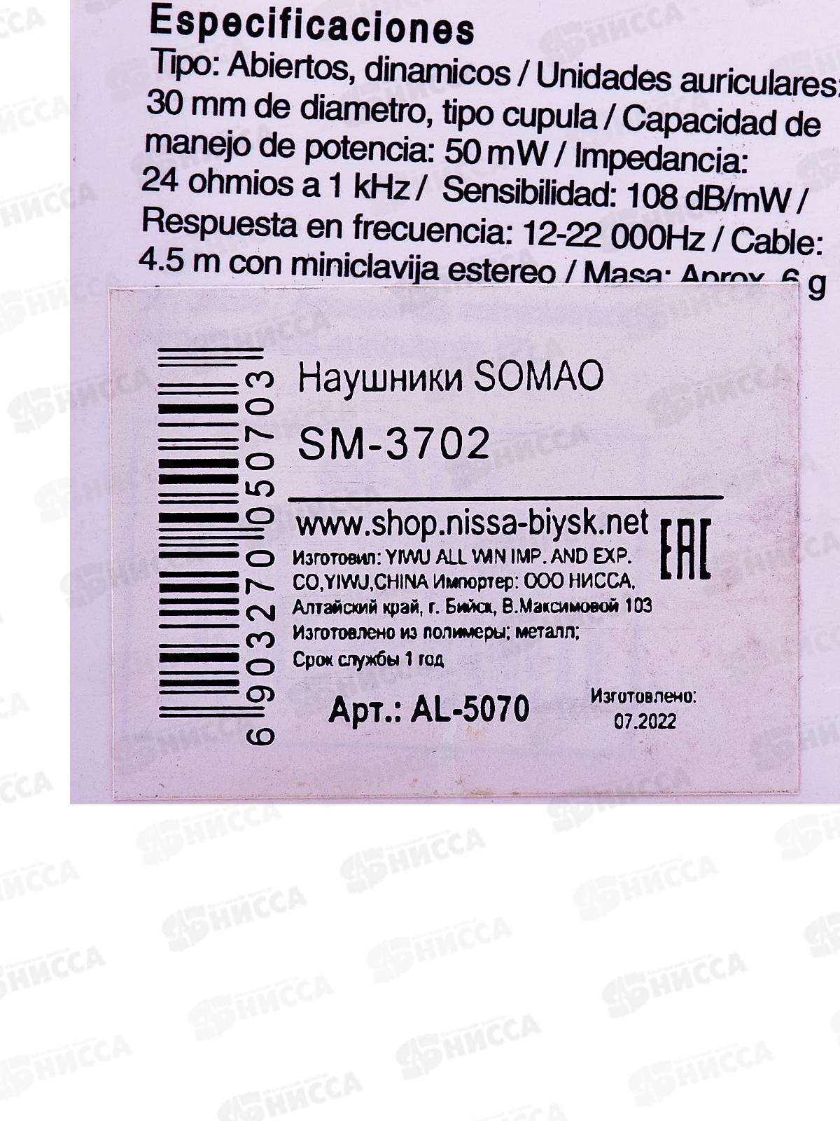 Наушники SOMAO SM-3702, AL-5070 *40/400