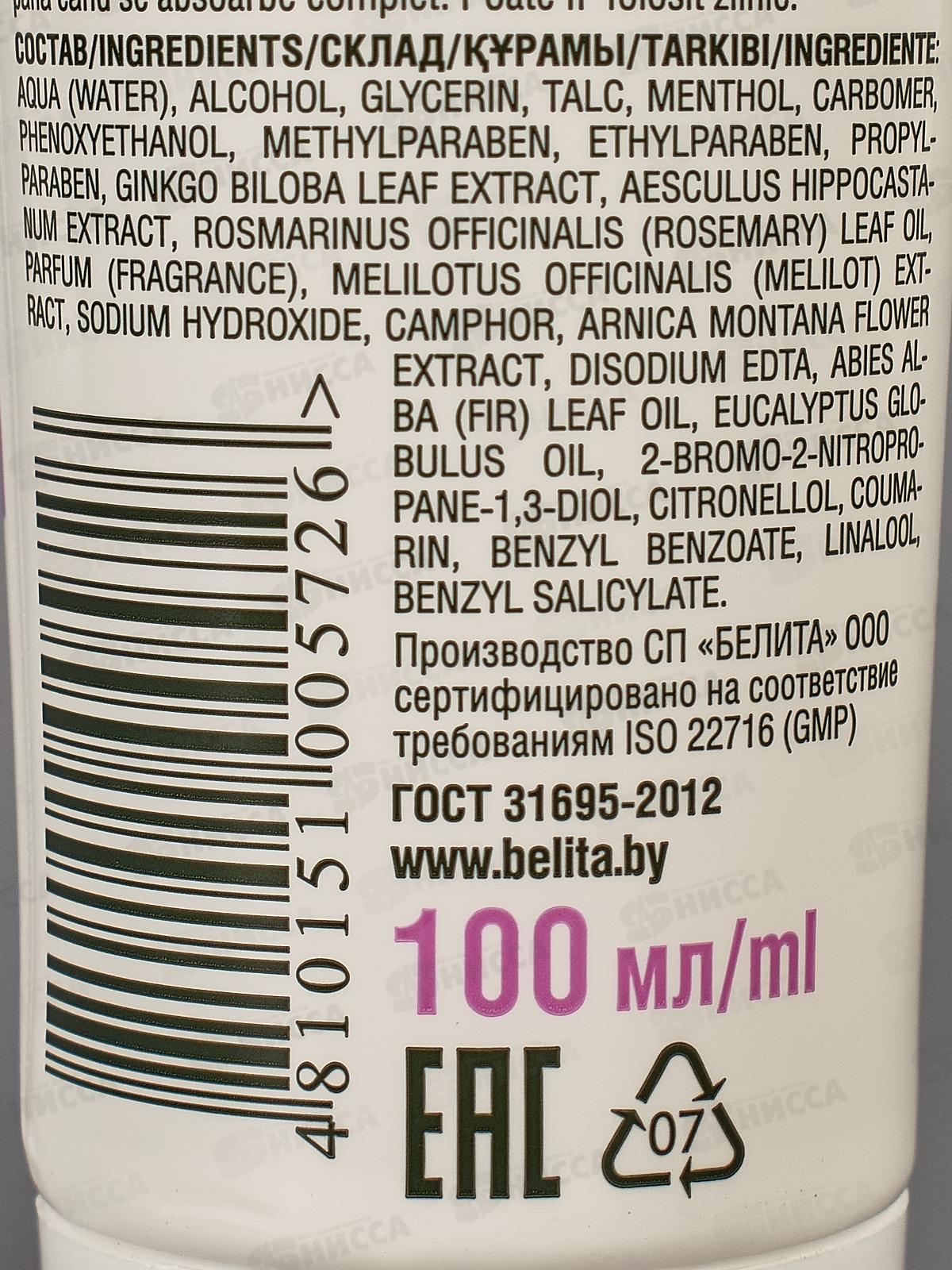 Идеальное средство для жаркого лета и для людей, постоянно испытывающих эффект «горящих» ног. Основан на 12 активных компонентах, которые обеспечивают ногам полный комфорт. Состав: Вода, спирт этиловый, глицерин, тальк, ментол, карбомер, феноксиэтанол, метилпарабен, этилпарабен, пропилпарабен, экстракт листьев Ginkgo Biloba, экстракт Aesculus Hippocastanum (конского каштана), масло листьев Rosmarinus Officinalis (розмарина), парфюмерная композиция, экстракт травы Melilotus Officinalis (донника), гидроксид натрия, камфора, экстракт Arnica Montana (арники), ЭДТА динатрия, масло хвои Abies Alba (пихты), масло Eucalyptus Globulus (эвкалипта), 2-бром-2-нитропропан-1,3-диол.