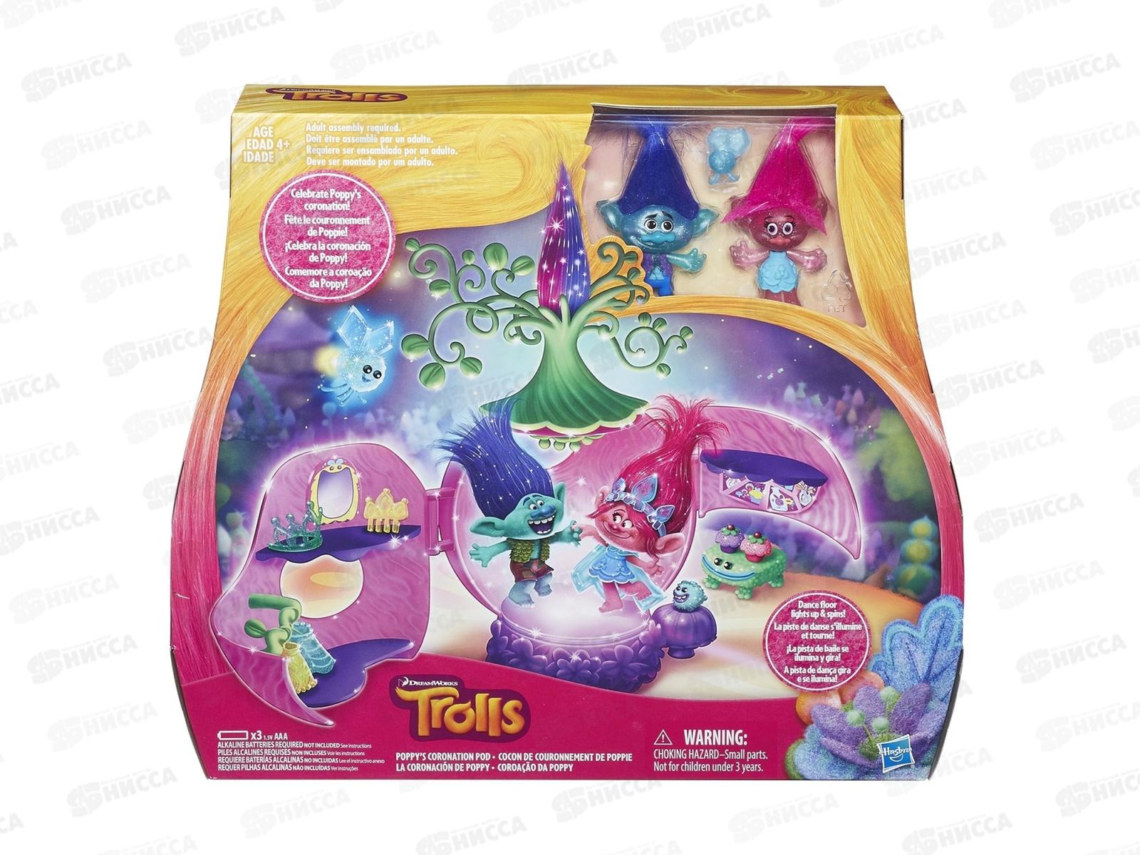 Игровой набор "Коронация" представлен небольшим домиком троллей, который исполнен в форме ягоды и 2 фигурками - виновницы торжества Розочки и ее друга. Внутри домика находится подиум, исполненный из полупрозрачного пластика и полочки, на которых можно расположить многочисленные наряды и аксессуары для интересной игры. Фигурки выполнены очень детально из полупрозрачного пластика с блёстками. В момент коронации фигурки можно поставить на подиум и включить подсветку, чтобы сделать момент торжества более зрелищным.
