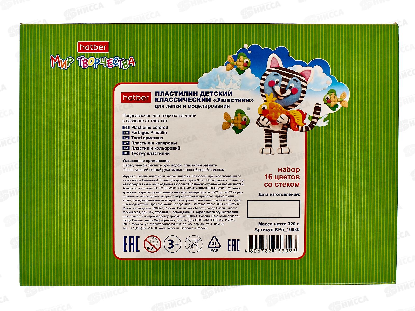 Пластилин 16 цветов 320 грамм Hatber Ушастики, со стеком, 16880 *10
