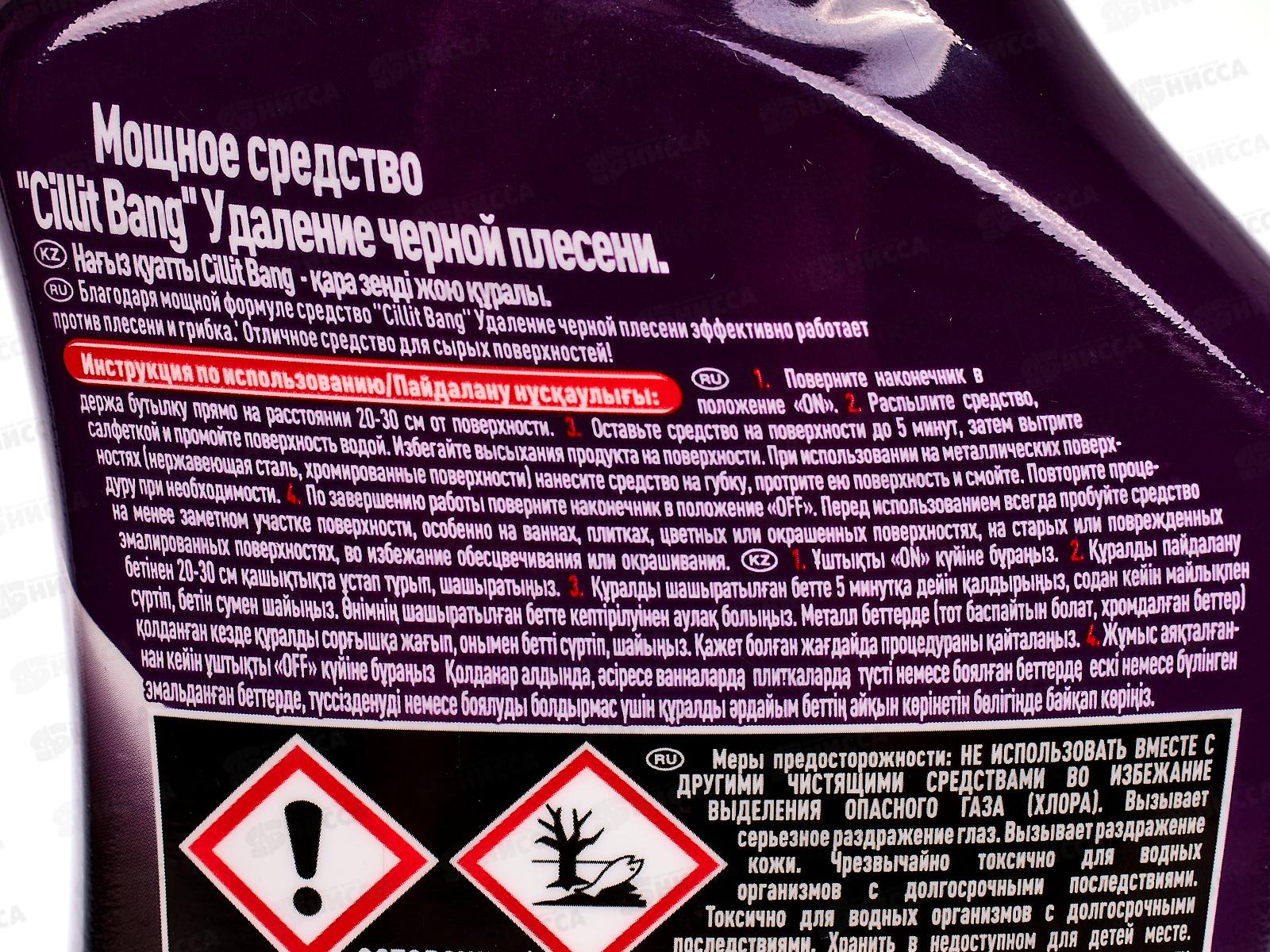 Благодаря мощной формуле "Cillit Bang" эффективно устраняет плесень и грибок. Теперь не нужно прикладывать усилия для того, чтобы оттереть въевшееся пятно. Средство идеально подходит для сырых поверхностей, подвергающихся образованию плесени и грибка. На некоторых поверхностях (гранит, мрамор, медь, латунь, глянцевые поверхности, линолеум, текстиль, ковры, резина, обработанный деревянный пол) не рекомендуется использовать Cillit Bang "Удаление черной плесени".