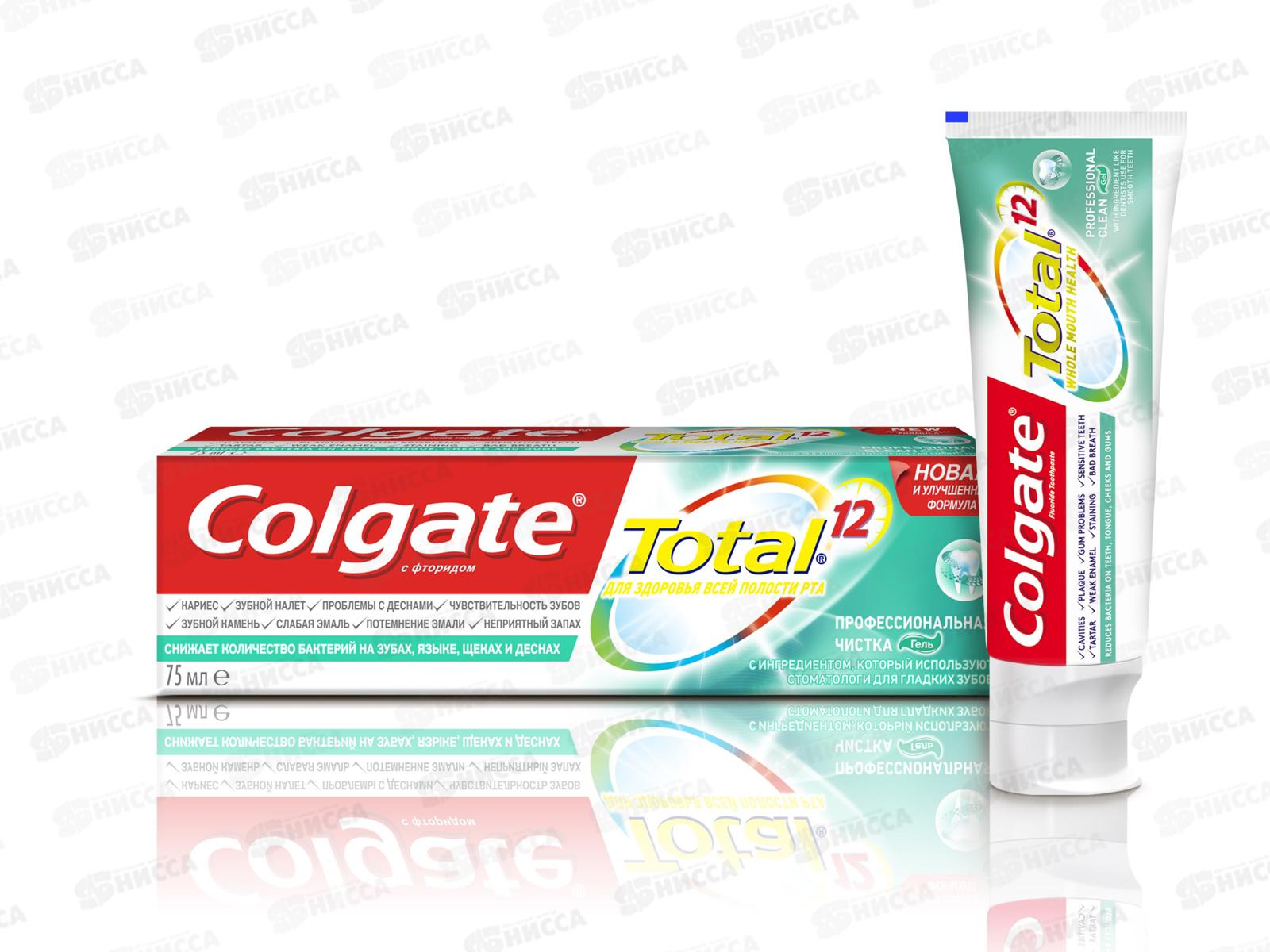 Colgate Total 12 Профессиональная Чистка с гелевой структурой содержит специальный ингредиент, который используется стоматологами для гладких и блестящих зубов надолго. Состав: Глицерин, Вода, Гидратированный диоксид кремния, лаурилсульфат натрия, Ароматизатор, Аргинин, Оксид цинка, Целлюлозная камедь, Полоксамер 407, Цитрат цинка, Тетранатриевый пирофосфат, ксантановая камедь, Бензиловый спирт, Кокамидопропилбетаин, фторид натрия, Сахарин натрия, сукралоза, Эвгенол, CI 77891, CI 74260, CI 47005.