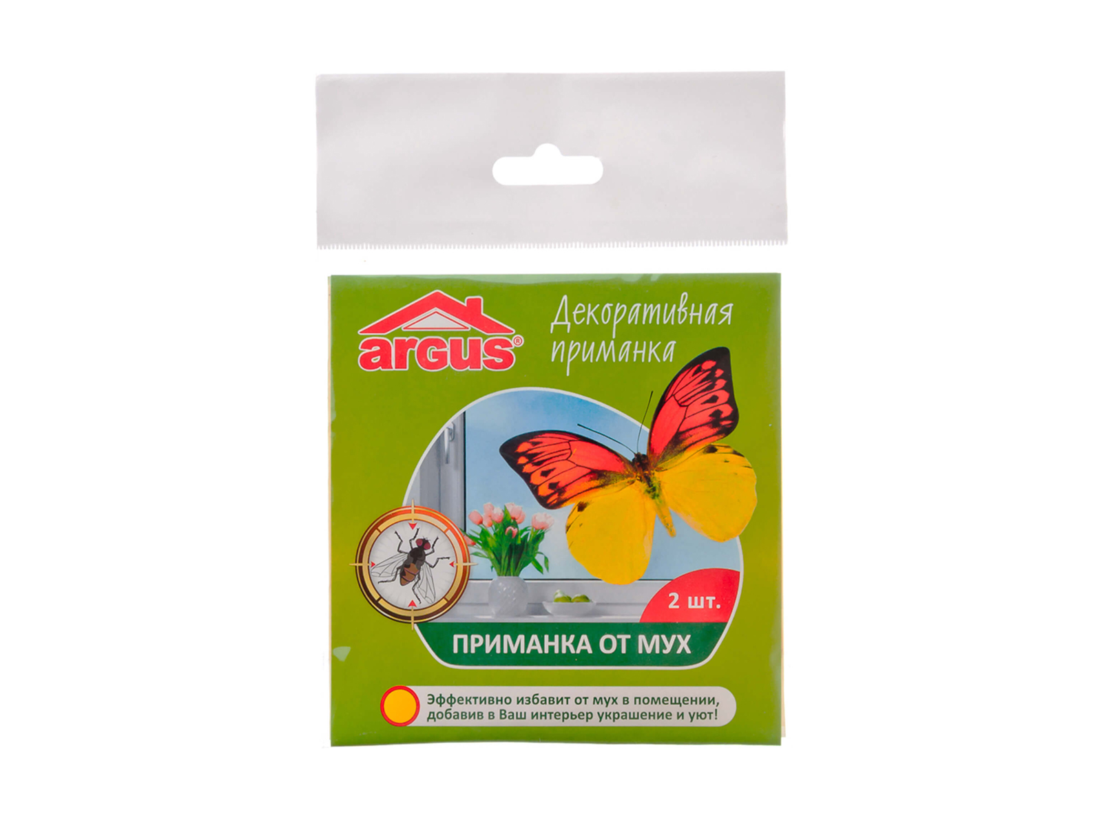 ARGUS оконная декоративная приманка БАБОЧКА для мух и др. насекомых (инсектицидная) 2 штуки в пакете. Предназначена для уничтожения мух. Представляет собой цветную самоклеящуюся картинку в форме бабочки (2 вида, размером 10см*10 см), на поверхность которой нанесена инсектицидная приманка. Картинка приклеивается самоклеящейся стороной к любой поверхности частой посадки мух. За счет содержания в своем составе пищевых компонентов приманка привлекает мух, они контактируют с поверхностью картинки и через несколько минут погибают за счет действия активного действующего вещества, не прилипая к поверхности картинки. Меры предосторожности: Использовать средство строго по назначению Хранить средство в упаковке, в местах, недоступных детям, отдельно от пищевых продуктов. Во время работы с приманкой соблюдать общие правила личной гигиены. Для сохранения эффективности избегать контакта приманки с водой. Состав: метомил 1%.