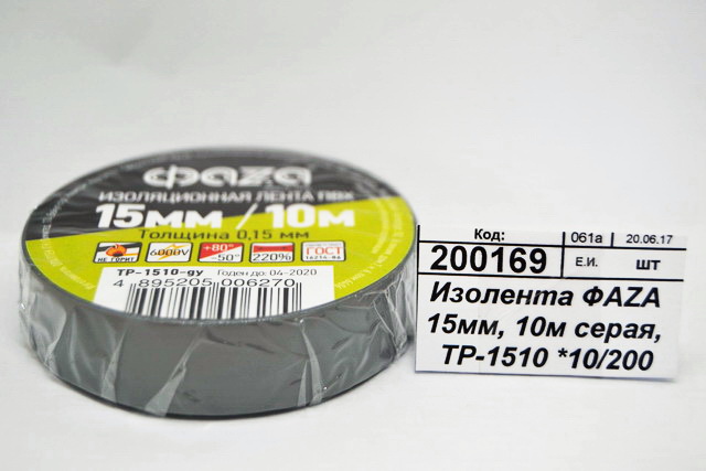Изолента ФАZA 15мм, 10м серая, TP-1510 *10/200