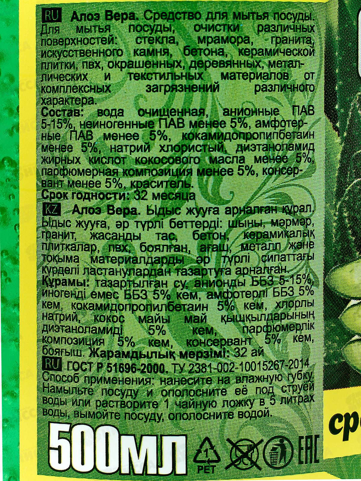 Средство для мытья посуды легко очищает посуду, образуя пышную пену. Эффективно очищает сложные загрязнения, расщепляет жир и удаляет налет от чая и кофе даже в холодной воде. - Полностью смывается с обрабатываемой поверхности, не оставляя разводов. - Входящие в состав увлажняющие компоненты помогают сохранить кожу рук мягкой и нежной. Подходит для очищения всех видов посуды, рабочих поверхностей столов, керамической плитки, столовых приборов из стекла, хрусталя, пластика, фарфора. СОСТАВ: очищенная вода, 5-15% смесь АПАВ, НПАВ менее 5%, амфотерные ПАВ менее 5%, кокамидопропилбетаин менее 5%, натрий хлористый, диэтаноламид жирных кислот кокосового масла менее 5%, парфюмерная композиция менее 5%, консервант менее 5%, краситель. ФАКТОРЫ УСПЕХА - Эффективно в холодной воде. - Полностью смывается с поверхности. - Идеальное сочетание цена/качество. - Не раздражает и не сушит кожу рук. ОБЛАСТЬ ПРИМЕНЕНИЯ: предназначено для применения в быту, в пищевой промышленности, на предприятиях общественного питания в учреждениях дошкольного и общего образования. Допускается использование средства в учреждениях медицинского профиля по назначению.