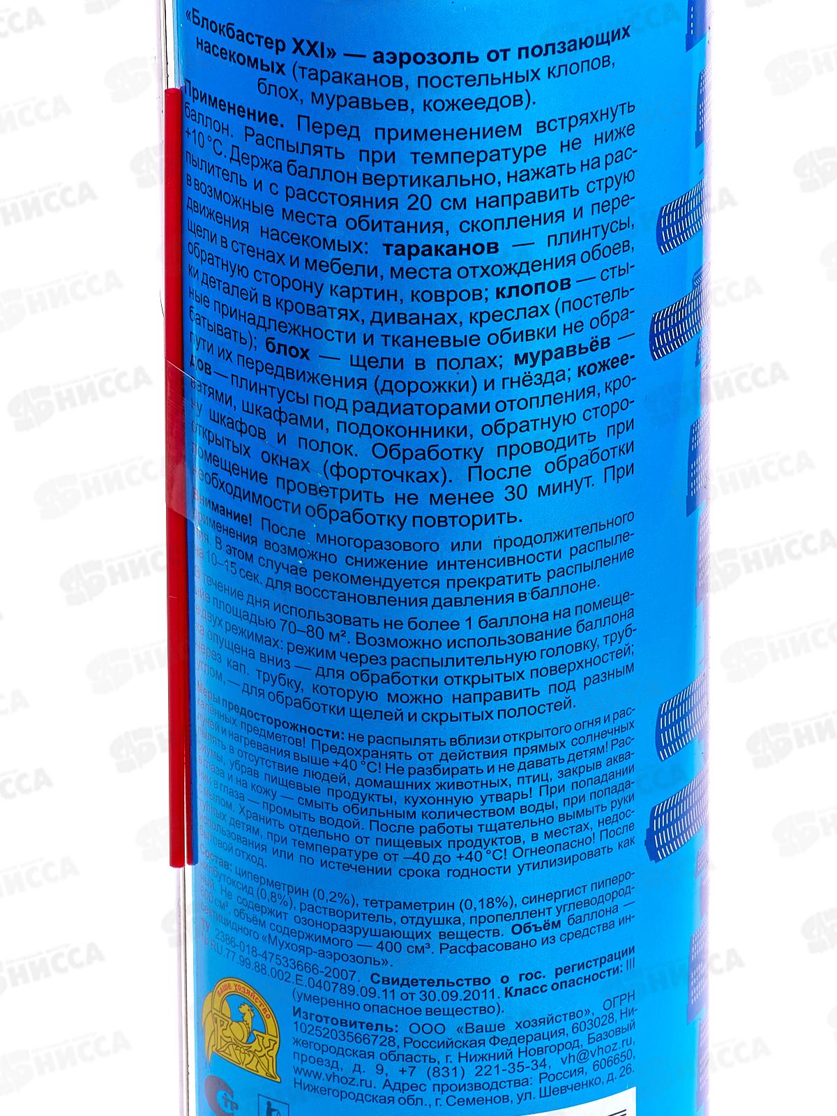 Аэрозоль от насекомых Ваше Хозяйство "Блокбастер XXI" применяется для борьбы с ползающими насекомыми. Возможно использование в жилых и офисных помещениях, а также на производственных объектах. Наличие распылительной трубки позволяет экономично использовать средство и уничтожает насекомых в труднодоступных местах. Одного баллона достаточно для обработки 80 кв.м. После обработки помещение проветрить в течение 30 минут. Распылять при температуре выше +10 С.