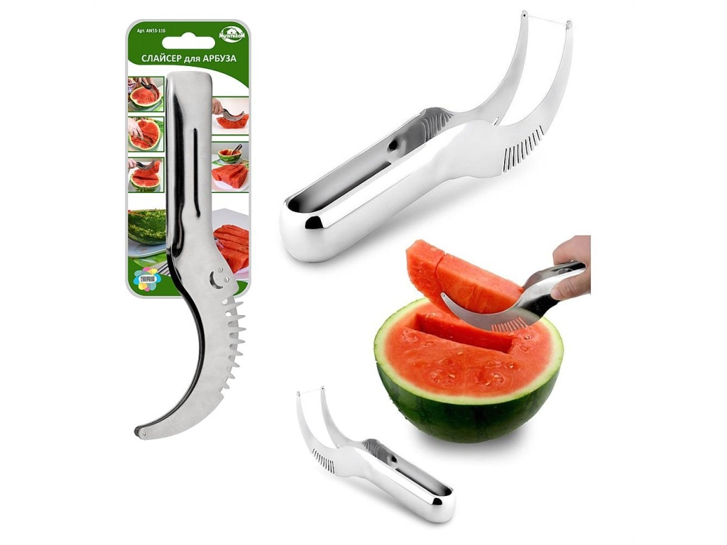 Уникальная конструкция слайсера позволит быстро и аккуратно порезать арбуз на ровные и одинаковые по толщине ломтики. С помощью слайсера вы извлечете только самую вкусную часть арбуза — мякоть. Приспособление служит еще и щипцами, с помощью которых можно захватить порезанные ломтики и перенести их на тарелку. Изделием просто пользоваться, гораздо удобнее, чем нарезать ломтики ножом. Изготовлено из коррозионностойкой (нержавеющей) стали.
