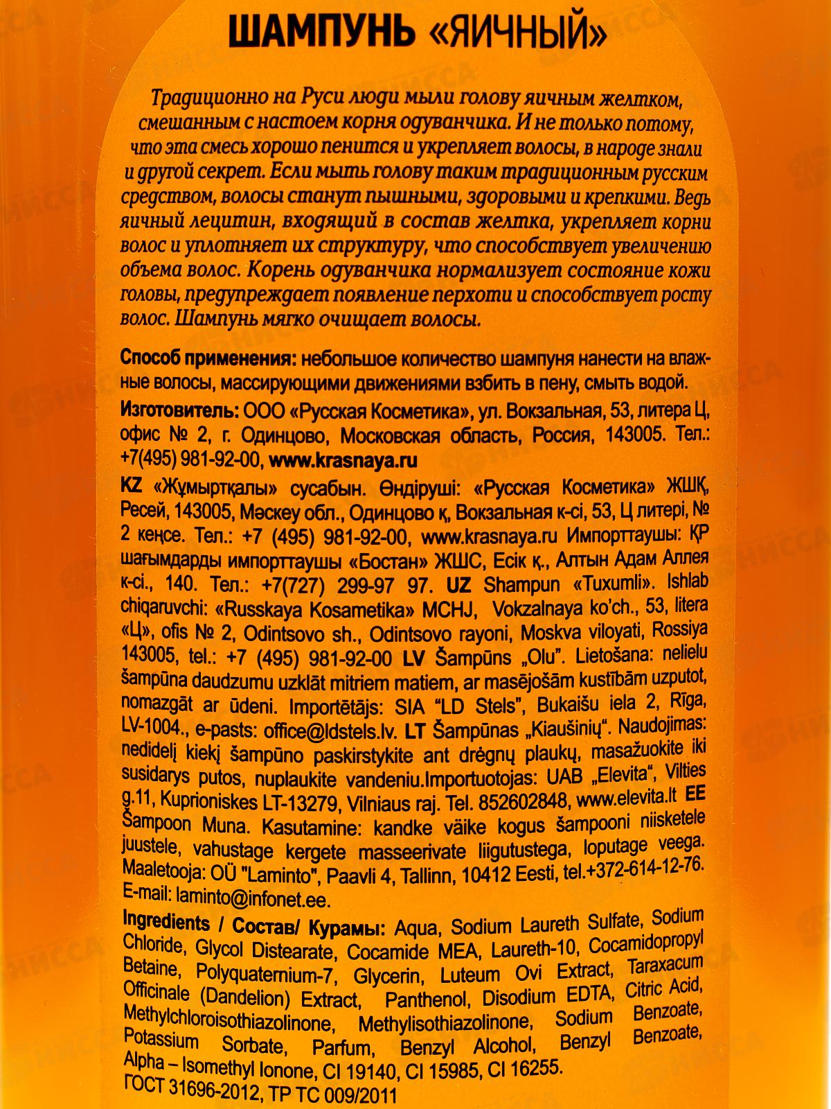 Состав: вода, лауретсульфат натрия, хлорид натрия, дистеарат гликоля, кокамид МЭА, лаурет-10, кокамидопропилбетаин, поликватерниум-7, глицерин, экстракт желтого яйца, экстракт одуванчика лекарственного (Taraxacum Officinale), пантенол, динатриевая ЭДТА, лимонная кислота, метилхлоризотиазолинон, метилизотиазолинон, бензоат натрия, сорбат калия, отдушка, бензиловый спирт, бутилфенилметилпропиональ, бензилбензоат, альфа-изометилионон, СI 19140, СI 15985, СI 16255.