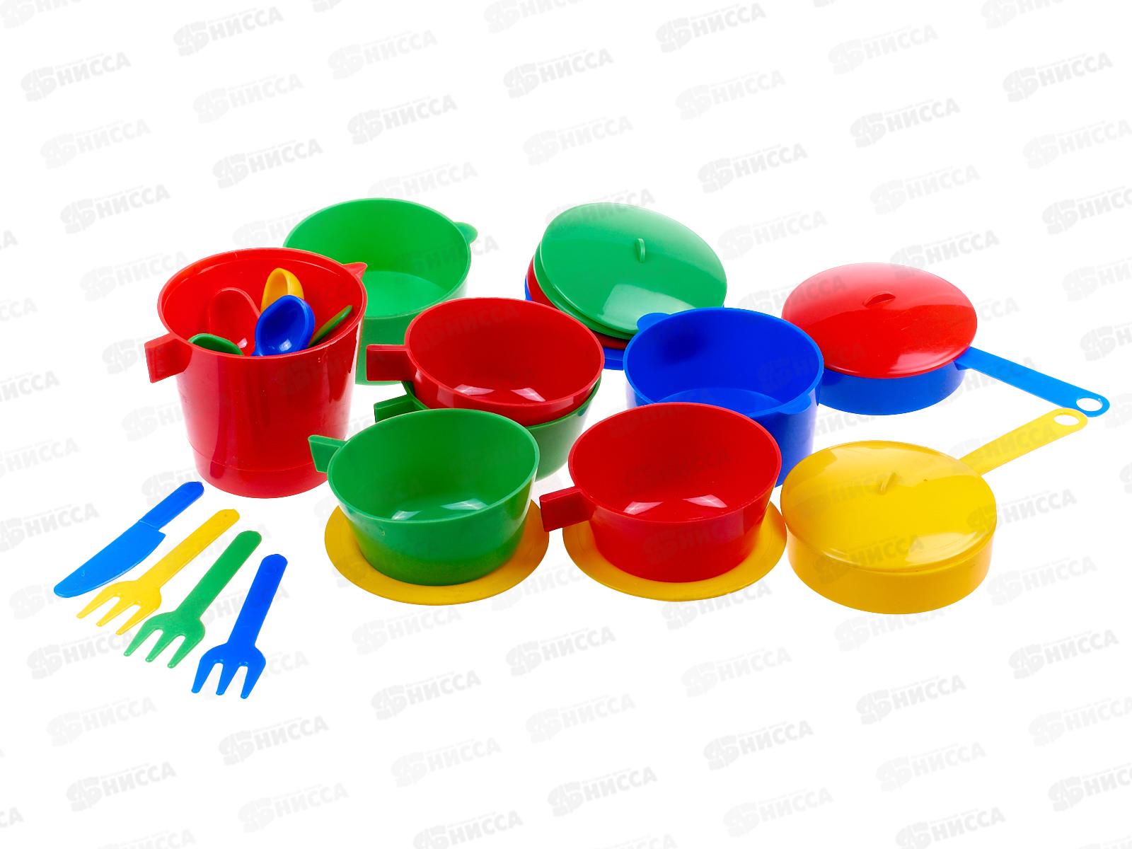 Набор развивает моторику рук, фантазию, мышление, коммуникативные навыки. Ребёнок учится использовать столовые приборы и другие кухонные атрибуты. В набор входит: 2 кастрюли, 2 сковороды, чайник, 4 блюдца, 4 чашки, 4 вилки, 4 ложки, 4 ножика.