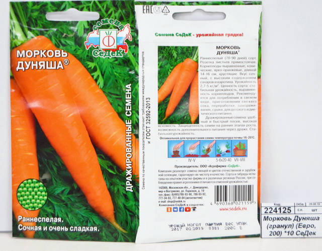 Гранулированные семена. Раннеспелый (70-90 дней) сорт. Розетка листьев прямостоячая. Корнеплоды выравненные, конические, ярко-оранжевые, длиной 14-16 см, хрустящие. Вкус сочный, с высоким содержанием сахаров и каротина. Урожайность 2,7-5 кг/м2. Ценность сорта: стабильная урожайность, выравненность корнеплодов. Рекомендуется для употребления в свежем виде, приготовления свежего сока, переработки, замораживания, сушки, для детского и диетического питания.