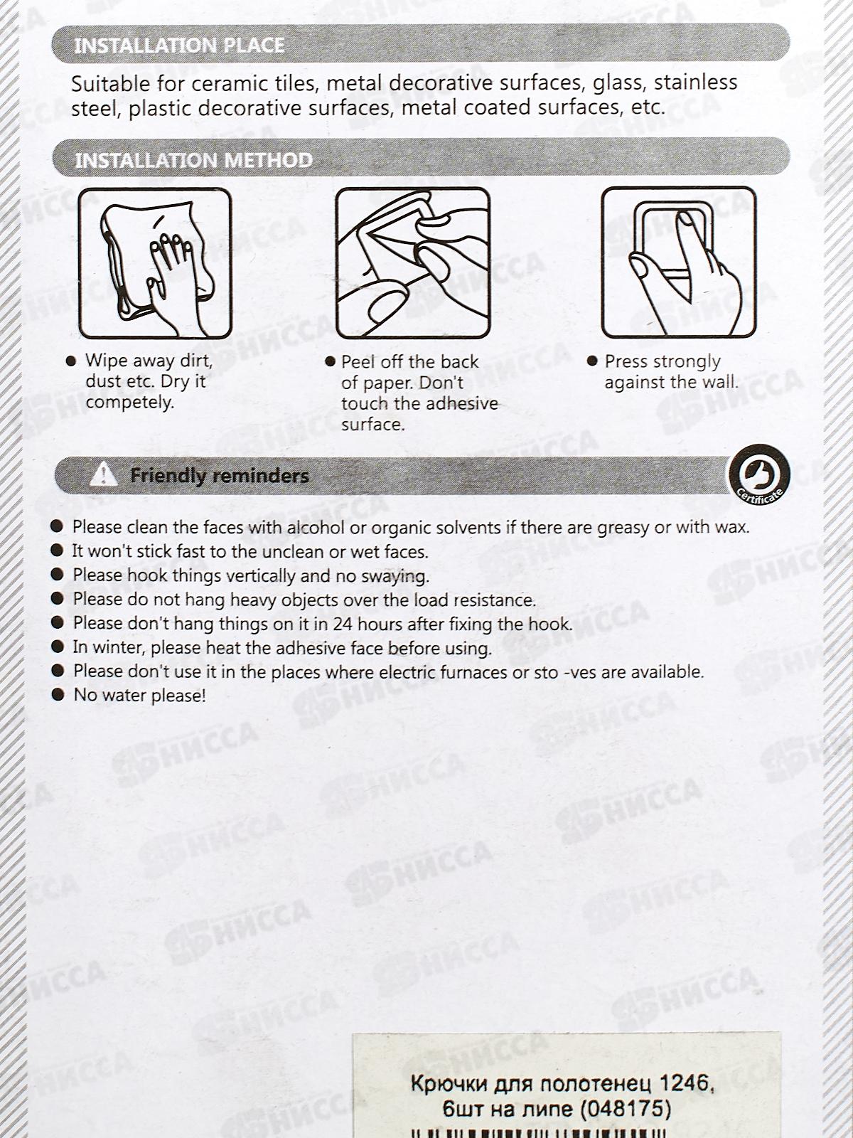 Характеристики: Артикул: 048175 Тип товара: Крючок Назначение: для полотенец Тип крепления: на липучке Диаметр: 3,5 см Количество крючков: 6 шт Материал: пластик, металл Упаковка: блистер