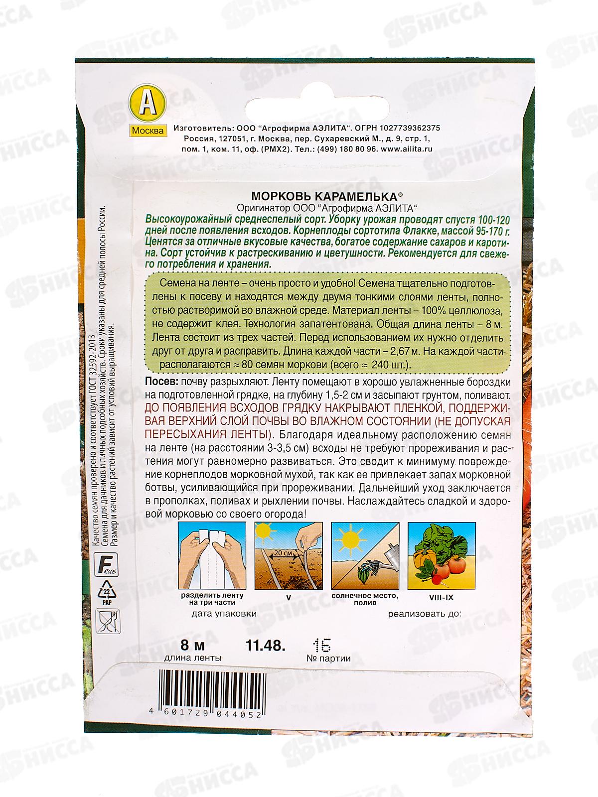 Высокоурожайный сорт, устойчивый к растрескиванию и цветушности. Уборку моркови проводят в ранние сроки, спустя 90-110 дней от всходов. Корнеплоды сортотипа Флакке, массой 95-170 г. Ценятся за отличные вкусовые качества, богатое содержание углеводов и каротина. Рекомендуются для свежего потребления и хранения. Посев: почву разрыхляют. Ленту помещают в хорошо увлажненные бороздки на подготовленной грядке, на глубину 1,5-2 см и засыпают грунтом, поливают. ДО ПОЯВЛЕНИЯ ВСХОДОВ ГРЯДКУ НАКРЫВАЮТ ПЛЕНКОЙ, ПОДДЕРЖИВАЯ ВЕРХНИЙ СЛОЙ ПОЧВЫ ВО ВЛАЖНОМ СОСТОЯНИИ (НЕ ДОПУСКАЯ ПЕРЕСЫХАНИЯ ЛЕНТЫ). Благодаря идеальному расположению семян на ленте (на расстоянии 3-3,5 см) всходы не требуют прореживания, и растения могут равномерно развиваться. Это сводит к минимуму повреждение корнеплодов морковной мухой, так как ее привлекает запах морковной ботвы, усиливающийся при прореживании. Дальнейший уход заключается в прополках, поливах и рыхлении почвы.