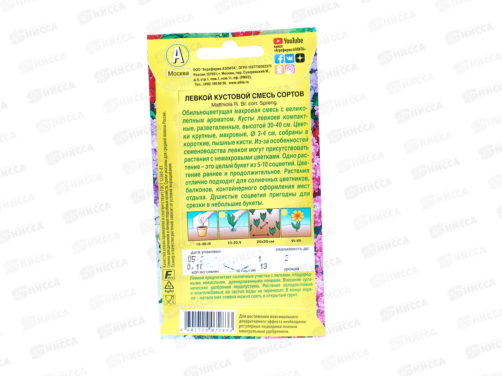 Обильноцветущая махровая смесь с велико лепным ароматом. Кусты левкоев компактные, разветвленные, высотой 30-40 см. Цветки крупные, махровые, 3-4 см, собраны в короткие, пышные кисти. Из-за особенностей семеноводства левкоя мо гут присутствовать растения с немахровыми цветками. Одно растение – это целый букет из 5-10 соцветий. Цветение раннее и продолжительное. Растения отлично подходят для солнечных цветников, балконов, контейнерно го оформления мест отдыха. Душистые соцветия при годны для срезки в небольшие букеты. Левкой предпочитает солнечные участки с ле гкими, плодородными, некислыми, дренированными почвами. Внесение ор ганических удобрений недопустимо. Растения холодостойкие и вла голюбивые, но застоя воды не переносят. В конце апреля – начале мая семена можно сеять в открытый грунт.