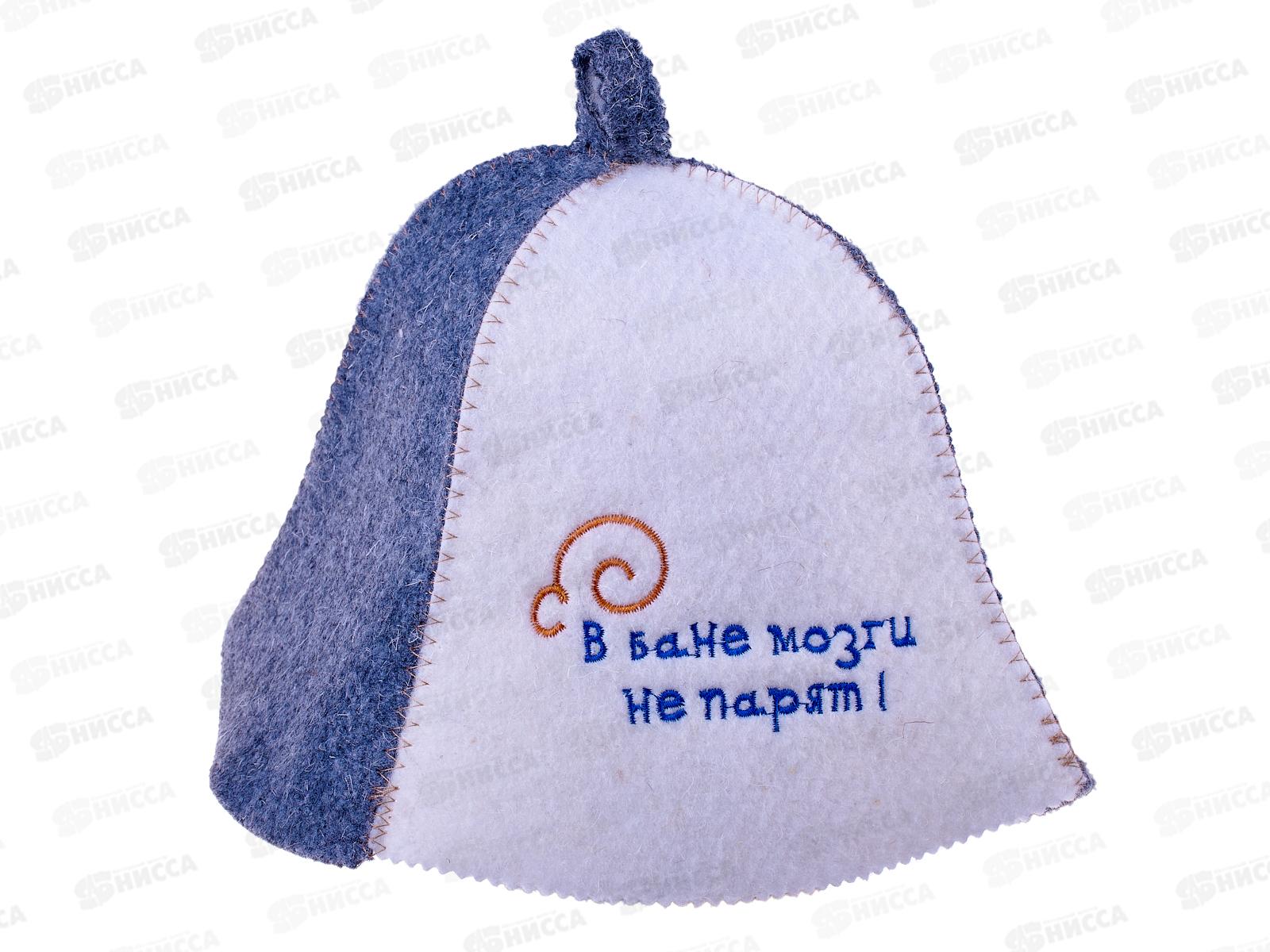 Легкая, удобная шапка из комбинации белого и серого войлока, украшенная вышивкой в виде шуточной поговорки "В бане мозги не парят!" Прекрасный атрибут банных процедур как для мужчин, так и для женщин.