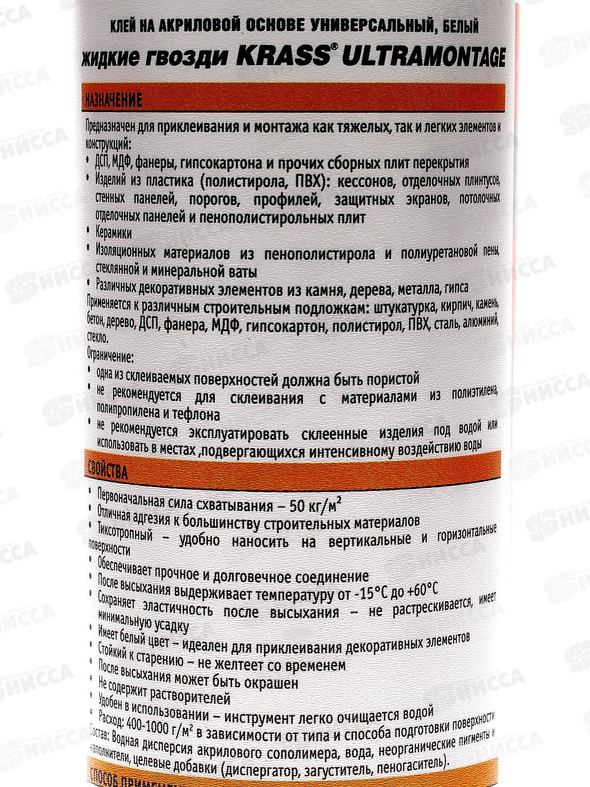 Жидкие гвозди Krass "Ultramontage" - универсальный монтажный клей на базе водной акриловой дисперсии. Жидкие гвозди образуют крепкое и устойчивое соединение даже при наличии воздушного зазора между склеиваемыми деталями, которое успешно заполняет клей и в отсутствии сильной усадки превращает две детали в единое целое. Имеет отличную адгезию к большинству строительных материалов. Жидкие гвозди Krass "Ultramontage" универсальные предназначены для приклеивания и монтажа как тяжелых, так и легких элементов и конструкций: ДСП, МДФ, фанеры, гипсокартона и прочих сборных плит перекрытия. Изделия из пластика (полистирола, ПВХ): кессонов, отделочных плинтусов стенных панелей, порогов, профилей, защитных экранов, потолочных отделочных панелей и пенополистирольных плит.