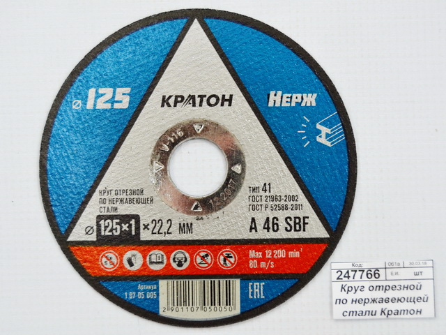 Круг отрезной по нержавеющей стали Кратон A46SBF 125х22х1,0мм