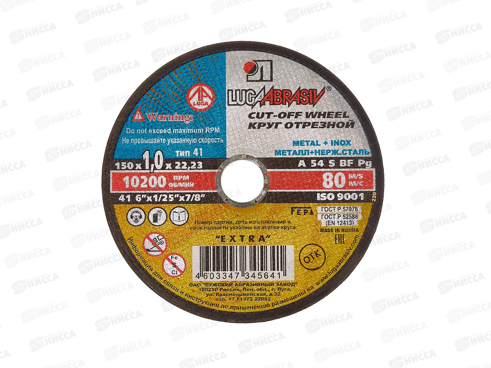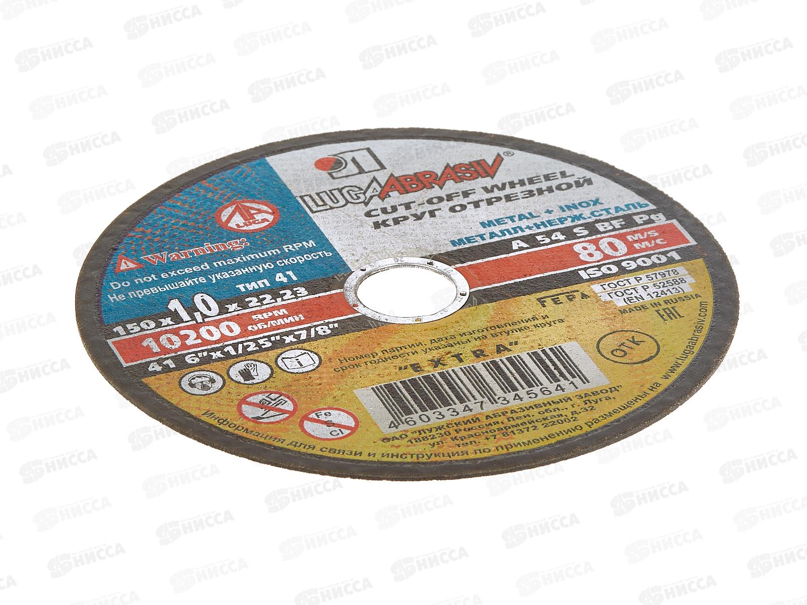 Круг отрезной по металлу применяется для реза элементов и конструкций из стали. Форма режущего круга — тип 41 (плоский). Основа — бакелитовая связка с наличием уплотняющих элементов (БУ, BF). Зернистость — A54. Максимальная скорость вращения абразивного отрезного диска составляет 10200 оборотов в минуту. Используется совместно с отрезными и шлифовальными машинами (угловыми шлифовальными машинами, УШМ, болгарками). Круг отрезной для болгарки имеет посадочный диаметр 22,23 мм и предназначен для УШМ, шлифовальных и отрезных машин со шпинделем 22,23 мм.