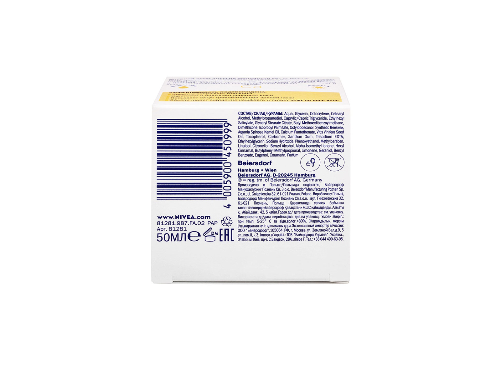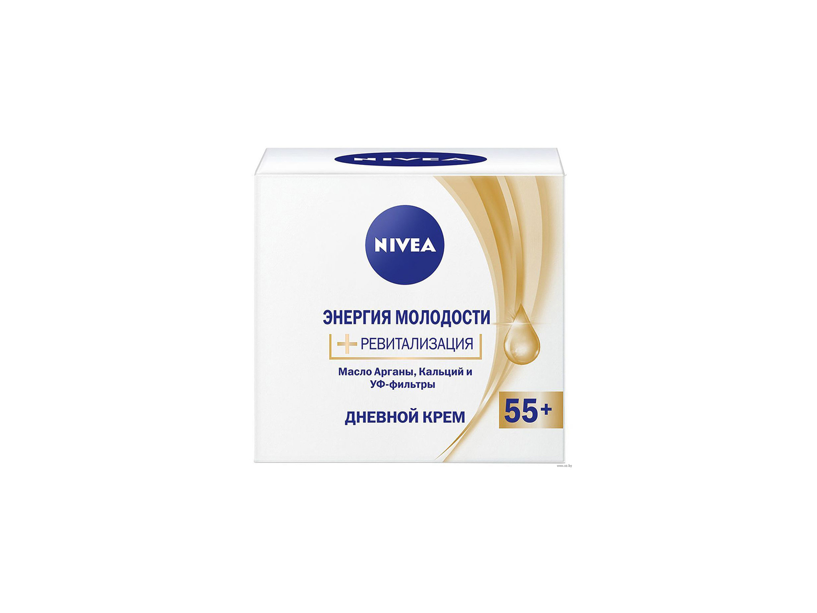 Дневной крем «Энергия Молодости» Восстановление 55+ с SPF 15 от бренда NIVEA заметно сокращает морщины, повышает тонус требовательной зрелой кожи и повышает устойчивость кожи к обезвоживанию. В составе содержатся масло арганы, кальций, а также УФ-фильтры, которые защищают кожу и предотвращают появление новых морщин. Состав: Aqua, Glycerin, Octocrylene, Cetearyl Alcohol, Methylpropanediol, Caprylic/Capric Triglyceride, Ethylhexyl Salicylate, Glyceryl Stearate Citrate, Butyl Methoxydibenzoylmethane, Dimethicone, Isopropyl Palmitate, Octyldodecanol, Synthetic Beeswax, Argania Spinosa Kernel Oil, Calcium Pantothenate, Vitis Vinifera Seed Oil, Tocopherol, Xanthan Gum, Carbomer, Trisodium EDTA, Ethylhexylglycerin, Caprylyl Glycol, Sodium Hydroxide, Phenoxyethanol, Linalool, Citronellol, Alpha-Isomethyl Ionone, Benzyl Alcohol, Geraniol, Limonene, Coumarin, Parfum