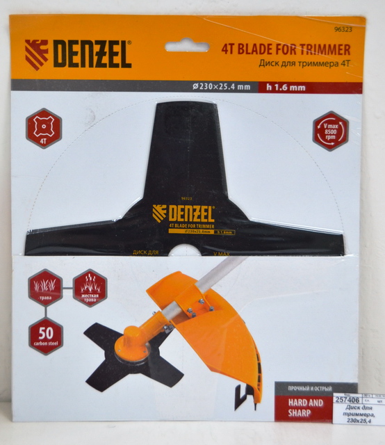 Диск для триммера, 4 лезвия DENZEL справляется с жесткой травой и мелкой порослью кустарников. Изготовлен из стали толщиной 1,6 мм и окрашен краской. Лезвия диска заточены с двух сторон, что повышает производительность данного диска.
