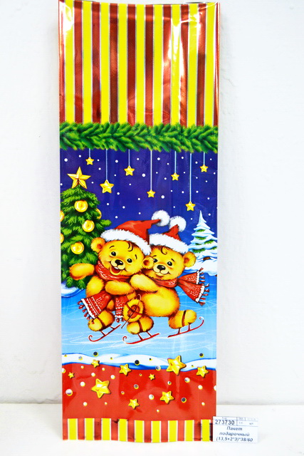 Пакет подарочный (13,5+2*3)*38/60 мкм Медведи на коньках *50/500