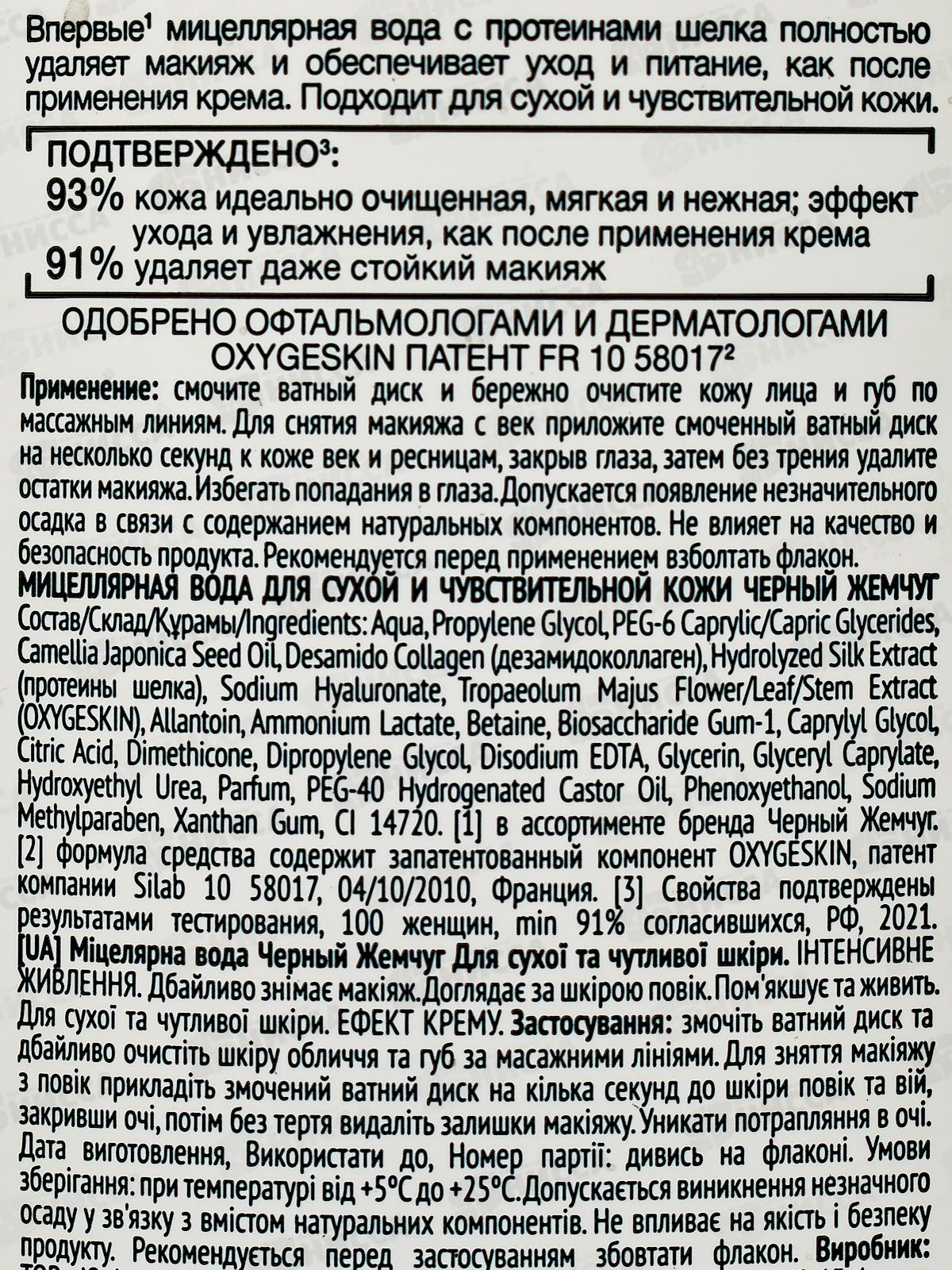 Мицеллярная вода для снятия макияжа "Эффект крема" с протеинами шелка для сухой и чувствительной кожи - это средство для очищения кожи, насыщенное протеинами шелка и мощным действием мицелл. Мицеллярная вода сочетает в себе силу средства для снятия макияжа и нежный уход, как после применения крема. Впервые мицеллярная вода удаляет макияж одним движением, а также обеспечивает уход и питание, как после применения крема: увлажняет и смягчает кожу с 1-ой секунды. Мицеллярная вода для сухой и чувствительной кожи – это средство для снятия макияжа с глаз, которое мгновенно дарит чувство комфорта и обеспечивает уход благодаря протеинам шелка и 20% активной сыворотки в составе с жидким коллагеном, камелией и гиалуроном. Умные мицеллы помогают бережно удалить макияж и загрязнения с кожи, а содержащиеся в составе жидкий коллаген, камелия, гиалурон и протеины шелка делают кожу более гладкой и бархатистой без ощущения сухости. В результате кожа идеально очищена, мягкая и нежная, даже стойкий макияж удален полностью. Мицеллярная вода эффект крема подходит для ежедневного применения. Мицеллярная вода Черный Жемчуг одобрена офтальмологами и дерматологами. Для красоты вашей кожи без сухости, обязательно очищайте ее 2 раза в день. Утром используйте гель для умывания для свежести лица, а вечером - мицеллярную воду для снятия макияжа.
