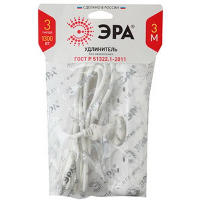Удобный бытовой удлинитель ЭРА UX(6)-3-3m на 3 розетки, без заземления. Рассчитан на одновременное подключение к розетке до трёх маломощных электроприборов. Максимальная нагрузка - 6 A/ 1300 Вт. Шнур оптимальной длины - 3 метра. Надёжный двухжильный провод ПВС. Корпус изготовлен из прочного негорючего полипропилена, в составе - защищающие от возгорания антипирены. Закруглённые углы, брендирование на вилке и корпусе, базовый белый цвет- этот удлинитель отличается аккуратным приятным дизайном.