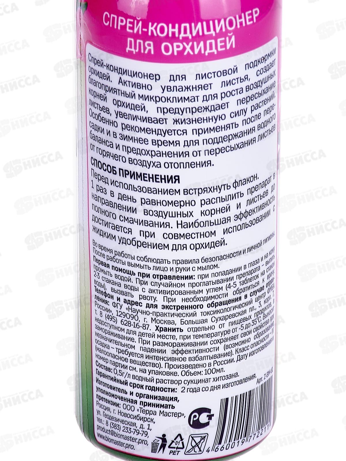 Орхидея спрей питательно-увлажняющий, 100мл Спрей-кондиционер для листовой подкормки орхидей. Активно увлажняет листья, cоздает благоприятный микроклимат для роста воздушных корней орхидей, предупреждает пересыхание листьев, увеличивает жизненную силу растения. Особенно рекомендуется применять после пересадки и в зимнее время для поддержания водного баланса и предохранения от пересыхания листьев от горячего воздуха отопления. Рекомендуется для комнатнх растений, таких как фаленопсисов, дендробиумов, цимбидиумов, каттлей и всех видов орхидей.