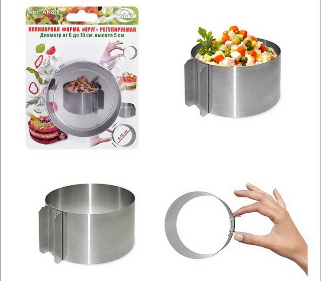 Для оформления блюд и выкладки салатов используйте регулируемую форму «Круг», изготовленную из нержавеющей стали. Форма регулируется в диаметре от 6 до 10 см. Высота изделия составляет 5 см. Чтобы уменьшить диаметр, разведите части ручки-держателя в разные стороны и зафиксируйте ее с помощью ползунка. После использования промойте губкой с использованием жидких моющих средств.