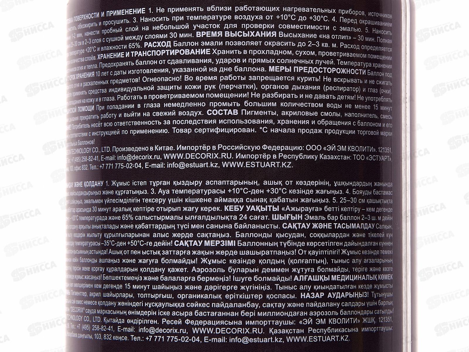 Высококачественная универсальная акриловая глянцевая эмаль DECORIX используется в декоративно-оформительских работах, строительстве и ремонте. Предназначена для окрашивания: древесины, пластика, металла, бетона, кирпича, керамики, стекла, картона, минеральных поверхностей. Аэрозольная эмаль удобна для окрашивания небольших поверхностей и труднодоступных мест. Образует гладкое, устойчивое к выцветанию покрытие.