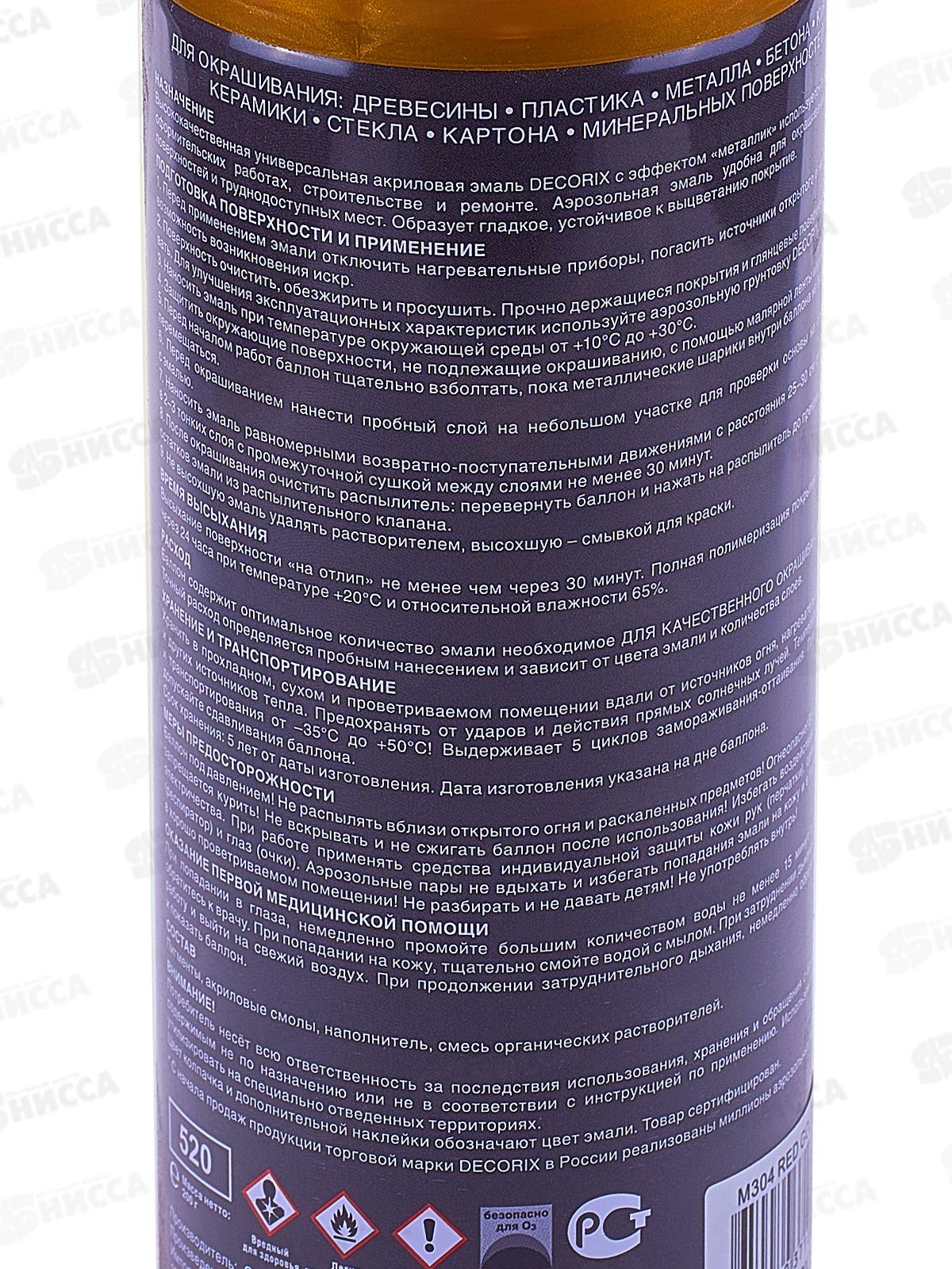 Высококачественная универсальная акриловая эмаль DECORIX с эффектом «металлик» используется в декоративно-оформительских работах, строительстве и ремонте. Предназначена для окрашивания: древесины, пластика, металла, бетона, кирпича, керамики, стекла, картона, минеральных поверхностей. Аэрозольная эмаль удобна для окрашивания небольших поверхностей и труднодоступных мест. Образует гладкое, устойчивое к выцветанию покрытие.