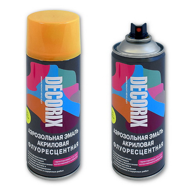 Высококачественная универсальная акриловая эмаль с флуоресцентным эффектом DECORIX используется в декоративно-оформительских работах, строительстве и ремонте. Предназначена для окрашивания: древесины, пластика, металла, бетона, кирпича, керамики, стекла, картона, минеральных поверхностей. При попадании света эмаль излучает ярко-сигнальный цвет. Применяется для создания надписей и изображений с целью улучшения видимости при эксплуатации и создания контрастных эффектов в росписи интерьеров. Больший эффект достигается при нанесении на белую поверхность. Аэрозольная эмаль удобна для окрашивания небольших поверхностей и труднодоступных мест. Образует гладкое, устойчивое к выцветанию покрытие.