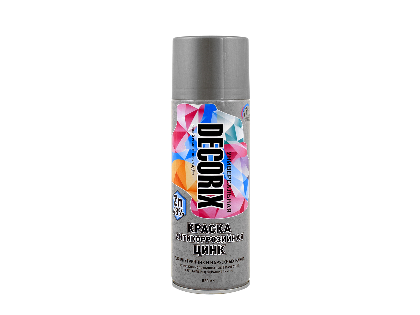 Особенность Цинковой краски DECORIX Zn 48% – возможность последующего окрашивания. Высококачественная краска DECORIX с содержанием цинка 48% предназначена для длительной защиты металлических поверхностей от коррозии и декоративного окрашивания. Применяется для окрашивания и антикоррозийной обработки металлических изделий и конструкций: крыш, водосточных труб, резервуаров, наружных отливов, оград, кованных изделий, сварных швов конструкций, консервации поверхностей и т. п., в том числе ремонтного окрашивания повреждённых оцинкованных поверхностей. Краска может использоваться в качестве грунтовочного антикоррозийного покрытия перед последующим финишным окрашиванием. Аэрозольная краска удобна для окрашивания конструкций сложных форм и труднодоступных мест.