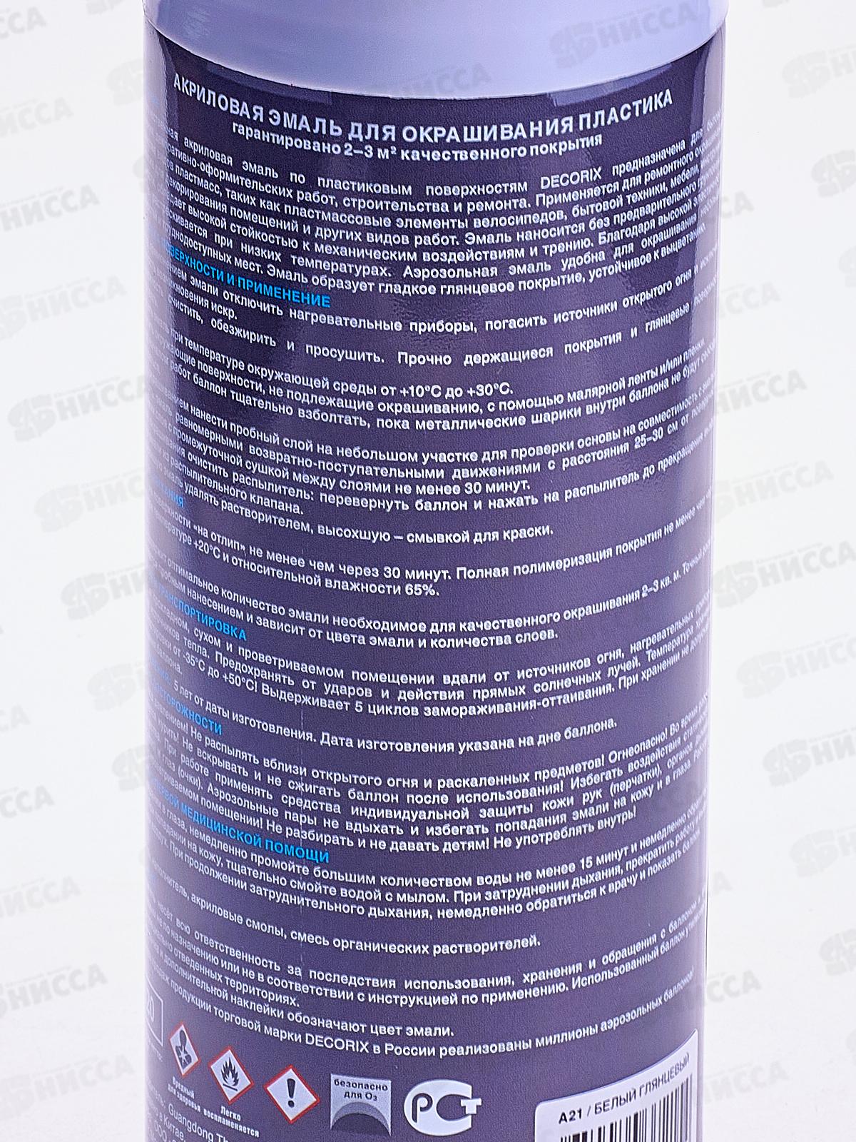 Высококачественная акриловая эмаль по пластиковым поверхностям DECORIX предназначена для бытового применения, декоративно-оформительских работ, строительства и ремонта. Применяется для ремонтного окрашивания большинства видов пластмасс, таких как пластмассовые элементы велосипедов, бытовой техники, мебели, инструментов, а также для декорирования помещений и других видов работ. Эмаль наносится без предварительного грунтования поверхности, обладает высокой стойкостью к механическим воздействиям и трению. Благодаря высокой эластичности эмаль не растрескивается при низких температурах. Аэрозольная эмаль удобна для окрашивания небольших поверхностей и труднодоступных мест. Эмаль образует гладкое глянцевое покрытие, устойчивое к выцветанию.