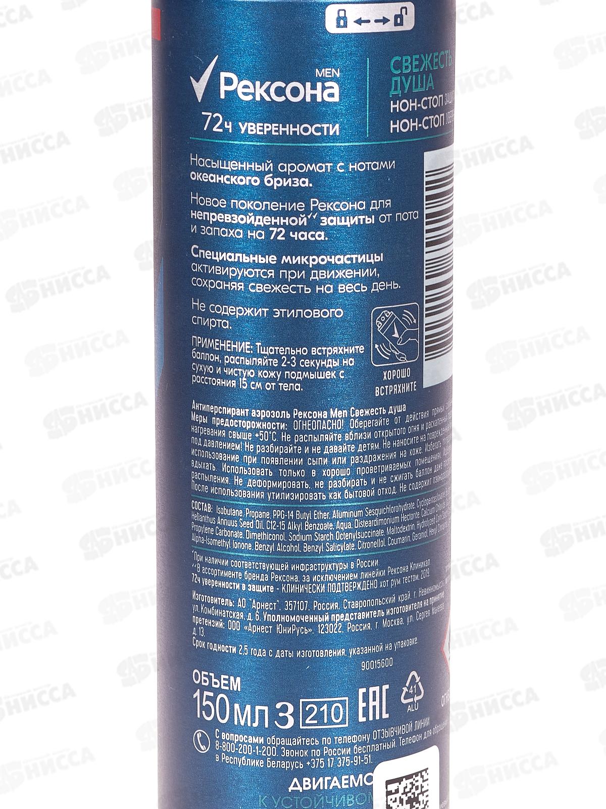 Дезодорант - антиперспирант спрей Rexona Men Свежесть душа продлевает ощущение бодрости и свежести после душа на целый день. Чистый свежий аромат заряжает бодростью и энергией, а технология Motionsense обеспечивает защиту именно в тот момент, когда она особенно необходима. Микрокапсулы, которые находятся на поверхности кожи, раскрываются, высвобождая дополнительный заряд свежести с энергичным мужским ароматом. Благодаря защите от пота и запаха на 48 часов ты будешь чувствовать свежесть с раннего утра и до позднего вечера. Прогулочный шаг, неспешная пробежка, спринтерский бег ? тебе все по плечу, ведь мы позаботились о твоей защите. Чем бы ты ни занимался, ты будешь чувствовать только уверенность и комфорт. Покоряете ли вы новую вершину, спешите ли на автобус, выступаете ли с докладом или идете на свидание, будьте уверены, вы надежно защищены от пота и запаха - что бы вы ни запланировали, у Rexona есть решение!