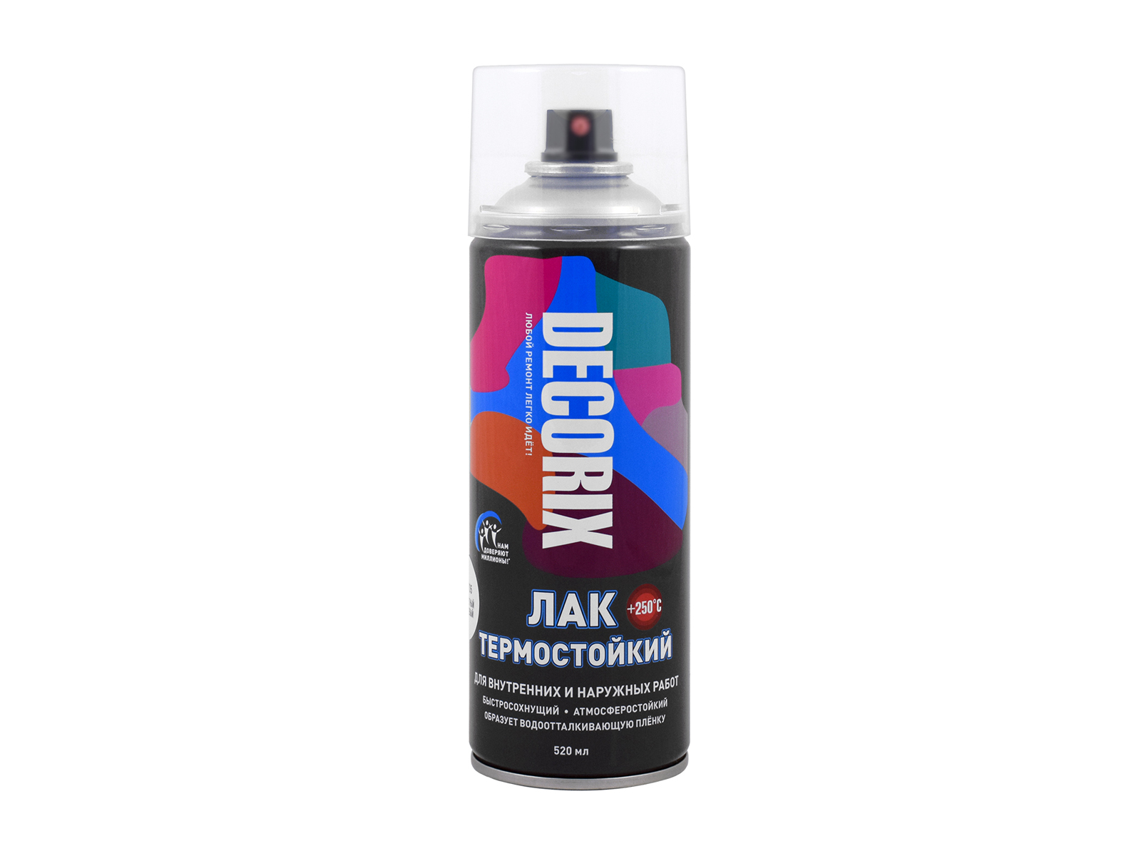Высококачественный термостойкий лак DECORIX предназначен для защиты и декорирования поверхностей, подверженных нагреванию до температуры +250 С, а также для бытового применения, строительства и ремонта. Предназначена для окрашивания: древесины, камня, металла, бетона, кирпича, керамики. При нанесении на пористые поверхности лак образует водоотталкивающую плёнку с эффектом «мокрого камня». Применяется для лакирования кирпичной кладки печей в банях и саунах, кладки каминов, металлических элементов водонагревательного оборудования и паропроводов, печных труб и других металлических, деревянных и минеральных поверхностей. Аэрозольный лак удобен для окрашивания небольших поверхностей и труднодоступных мест.