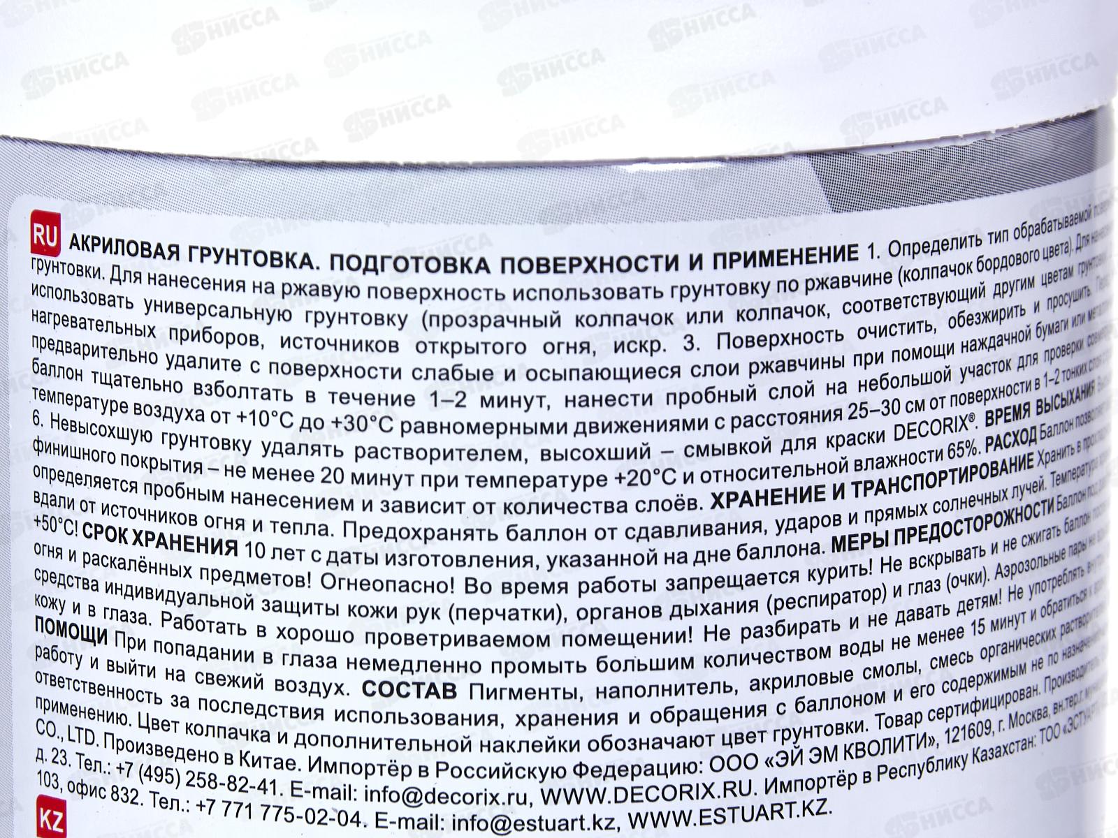 Высококачественная грунтовка DECORIX предназначена для подготовки поверхностей перед последующим окрашиванием любыми видами лакокрасочных материалов при бытовом применении, декоративно-оформительских работах, строительстве и ремонте. Грунтовка применяется для увеличения адгезии окрашиваемой поверхности с последующими слоями наносимых материалов, укрепления слабых поверхностей и снижения расхода последующих слоёв краски, лака или эмали. Грунтовка обладает прекрасными порозаполняющими свойствами, образуя равномерно впитывающую поверхность. Аэрозольная грунтовка удобна для нанесения на труднодоступные поверхности. Идеально подходит для поверхностей из металла, древесины, бетона, камня, стекла, картона, керамики и некоторых видов пластмасс. Для нанесения на ржавую поверхность использовать грунтовку по ржавчине (колпачок бордового цвета). Для нанесения на чистые от ржавчины поверхности использовать универсальную грунтовку (прозрачный колпачок или колпачок, соответствующий другим цветам грунтовки).